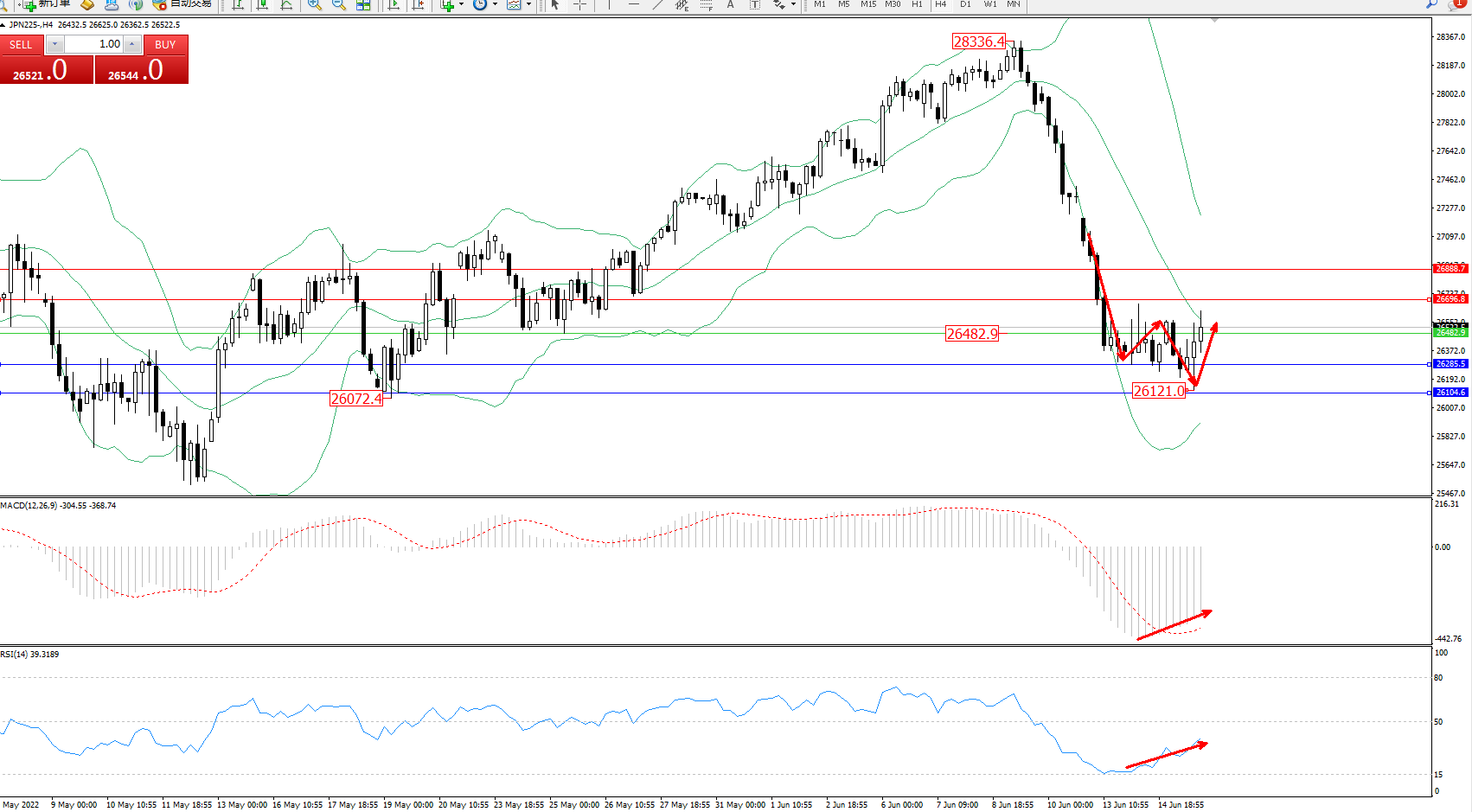 技术点评:空头动力延续布林带指标下轨附近持续震荡下行,低位抵达26121附近节点后震荡平移,多头动力开始缓慢伺机入,触及布林带指标中轨附近节点后整理,布林带指标呈收口走势持续中,MACD指标处于空头区域低位震荡缓慢上移,RSI指标处于空头区域低位维持震荡拉升;