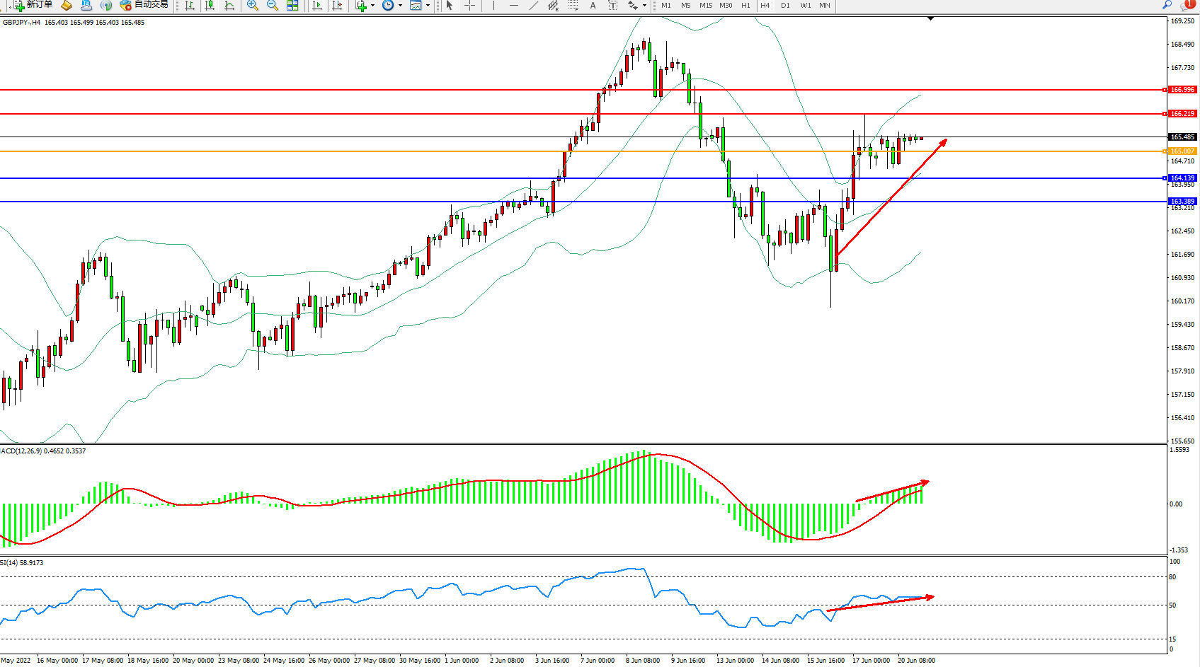 4小时图看:多头动力强势拉升上移,突破布林带指标上轨附近节点后开始整理,短期多头上移有继续向上拉升态势,布林带指标呈收口走势持续显示移动中,MACD指标处于0轴线上方弱势徘徊中,RSI指标处于50均衡线上側窄幅整理;