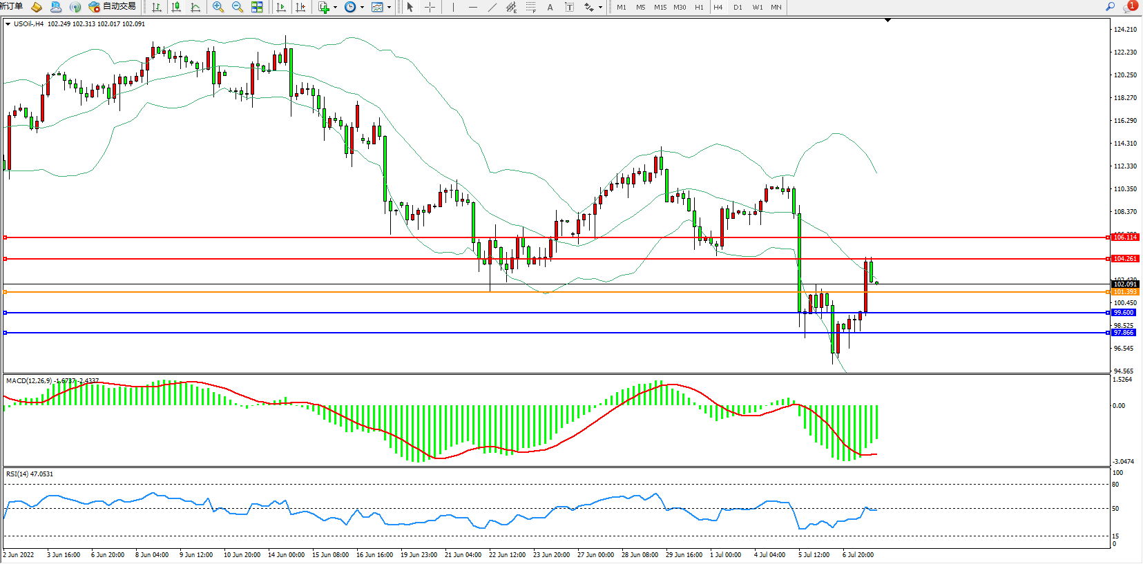 原油维持102.091附近震荡,美国至7月1日当周EIA原油库存 823.5万桶,预期-104.3万桶,前值-276.2万桶。美国至7月1日当周除却战略储备的商业原油库存为2022年5月6日当周以来最高。