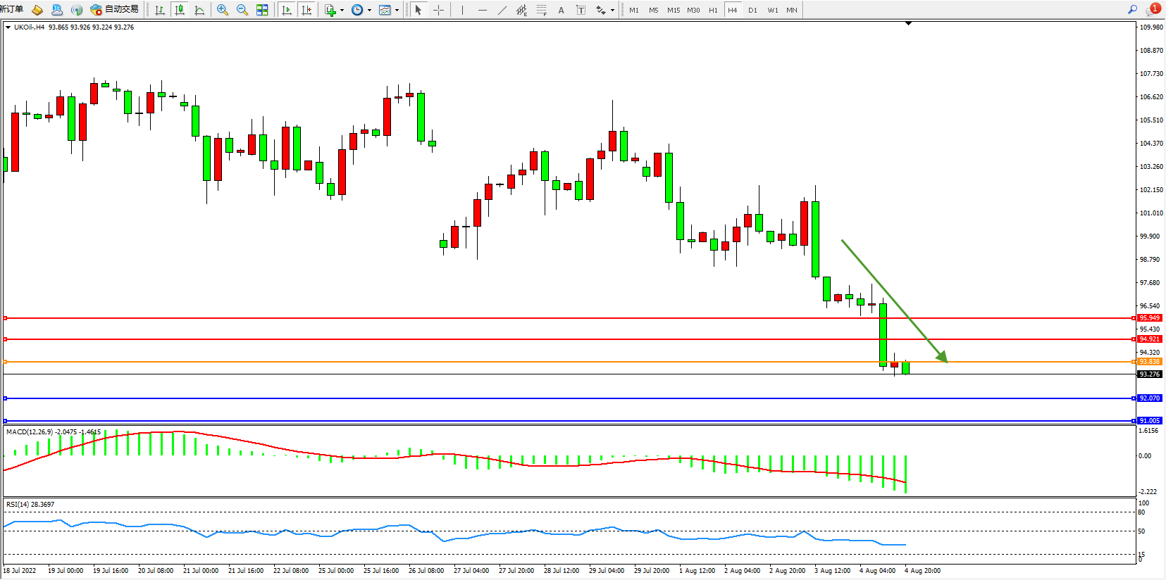 4小时图看:市场空头动力持续震荡下行,短期跌势未见有止步迹象,且空头下行态势良好,MACD指标处于空头区域维持弱势向下移动中,RSI指标处于空头区域维持弱势徘徊;