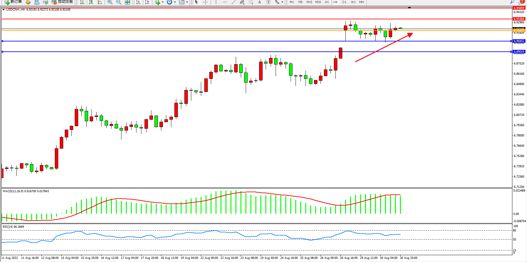 交易策略:6.91839上方看涨,目标6.93366、6.94809