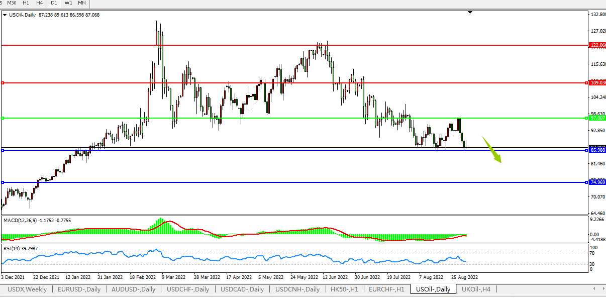 日线图看:油价持续弱势再度试探前期低点, MACD量能柱0轴下方小幅放量,RSI指标快速走弱,短期价格或有反复,但中期依旧不容乐观。