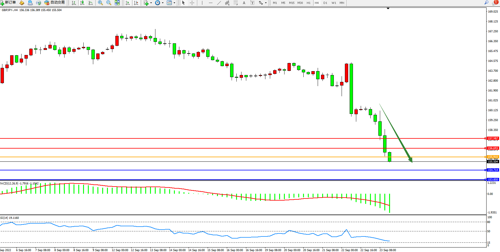 英镑日圆GBPJPY——4小时K线图显示: