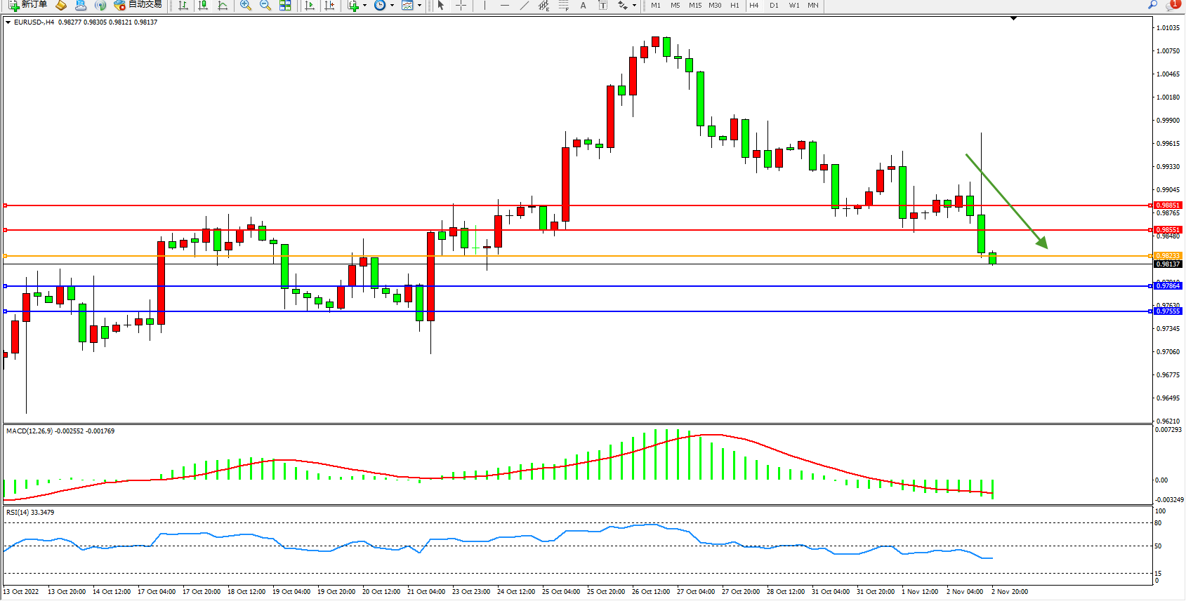 欧元美元EURUSD—4小时K线图显示: