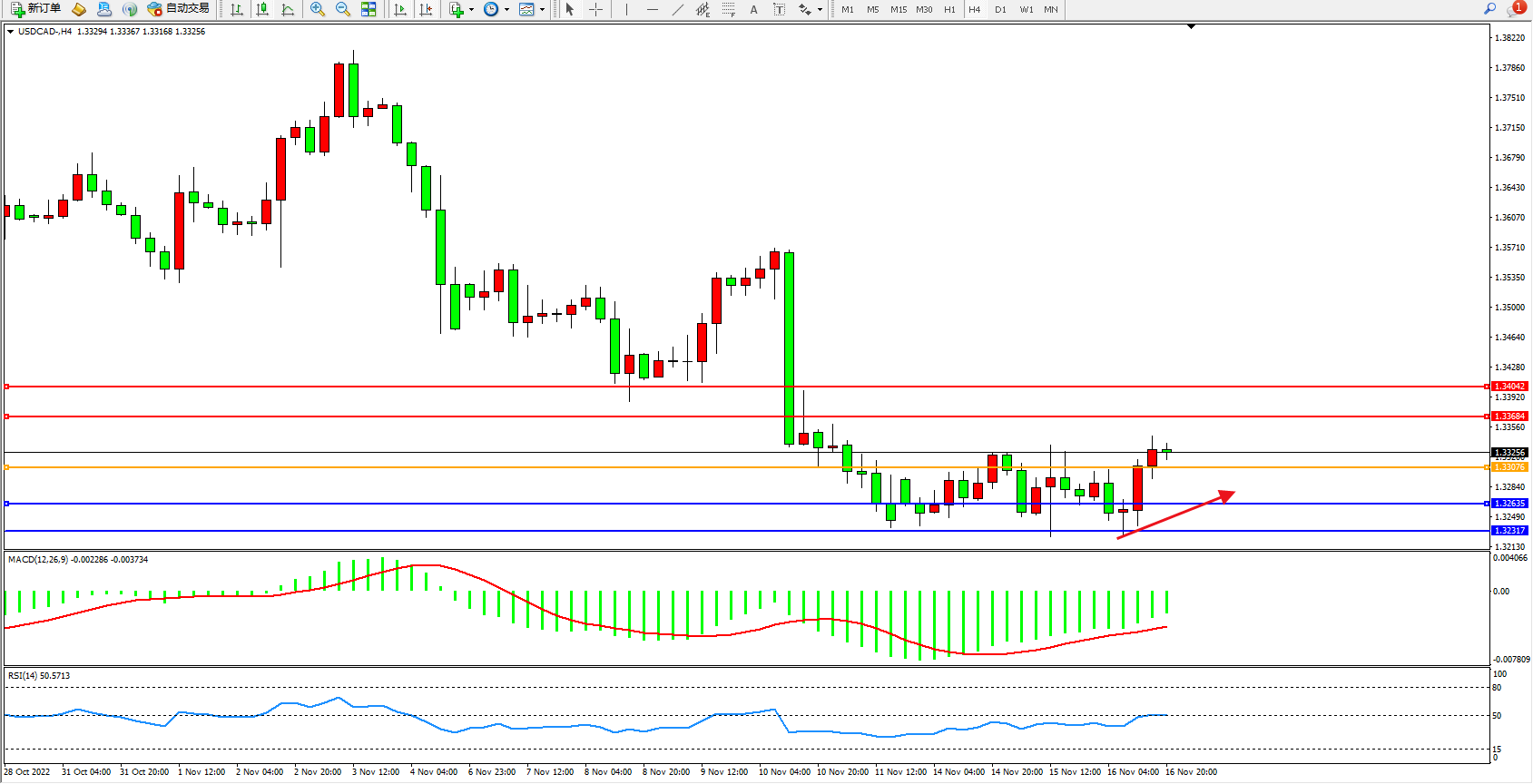 4小时图看:低位窄幅区间震荡后,多头动力伺机入场拉升,短期多头有继续向上移动迹象,MACD指标处于空头区域整理上行,RSI指标处于50均衡线附近弱势徘徊中;