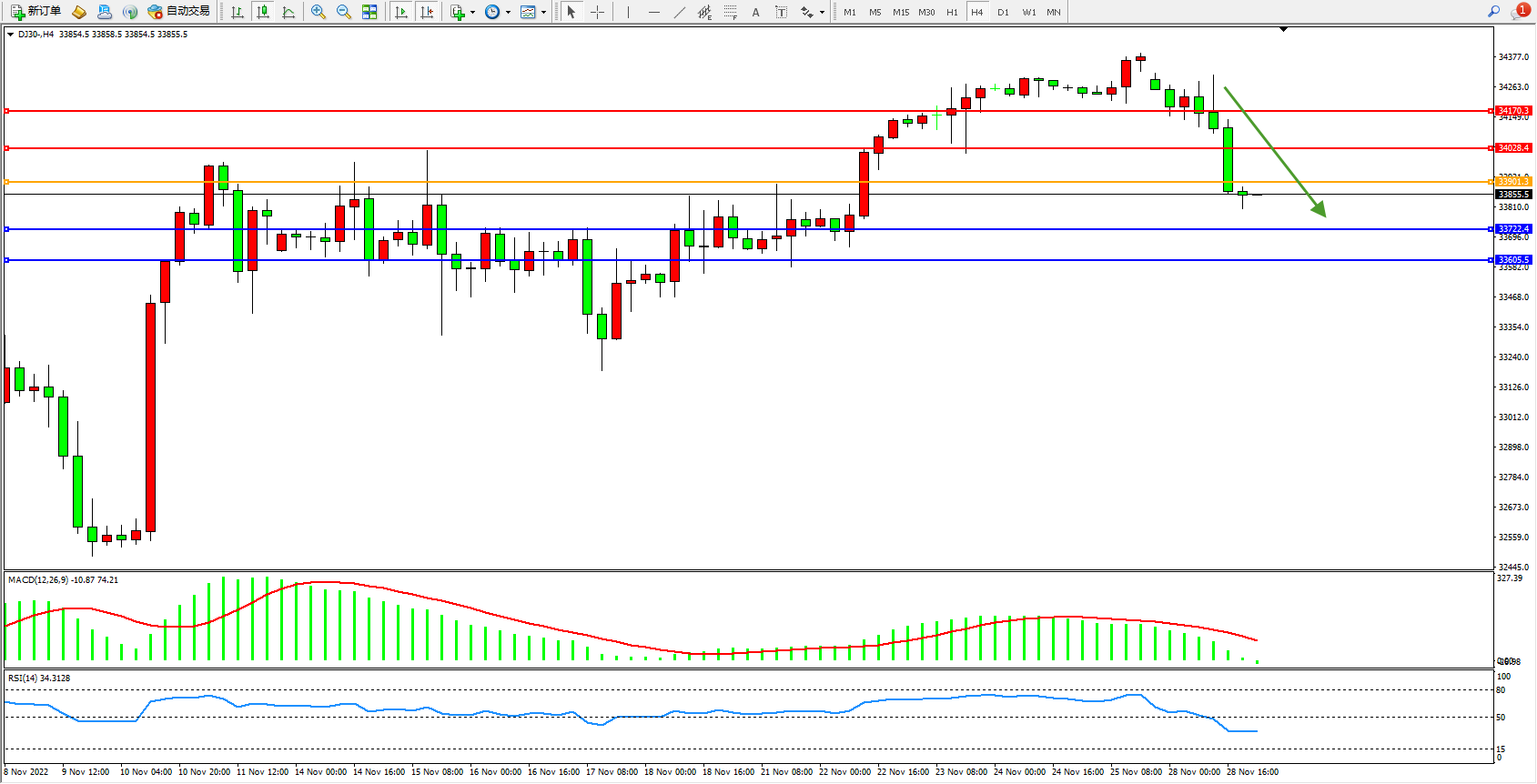 道琼斯指数11月28日(周一)收盘下跌497.57点,跌幅1.45%,报33849.46点;美联储主席鲍威尔将于周三(11月30日)在布鲁金斯学会举办的活动上就美国经济和劳动力市场前景发表讲话,这可能为美国货币政策前景提供更多线索。