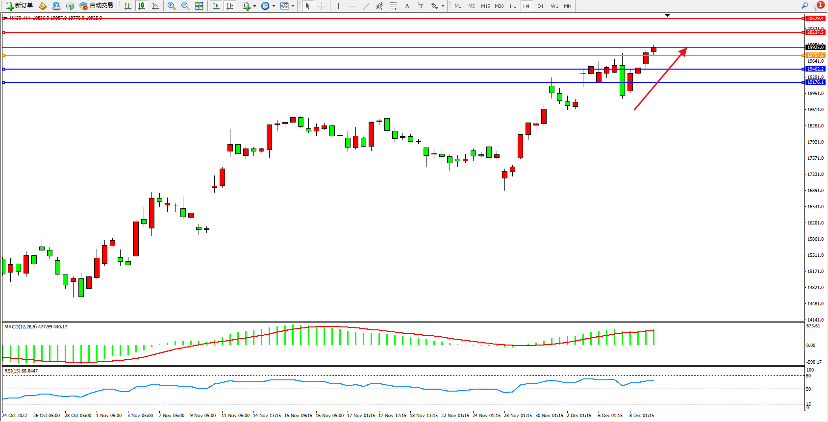 香港恒生指数12月9日(周五)收盘上涨450.64点,涨幅2.32%,报19900.87点;内地疫情防控持续优化,港股延续昨日涨势,三大指数早盘小幅走低后持续拉升,恒指涨2.32%逼近2万点大关,国指涨2.51%,恒生科技指数涨2.33%,三者均刷新阶段高价。大型科技股全线拉升上扬,美团、百度涨超5%,小米、腾讯、阿里巴巴、快手皆有涨幅;南下资金全日净流入42.51亿港元,大市成交额为1994亿港元。