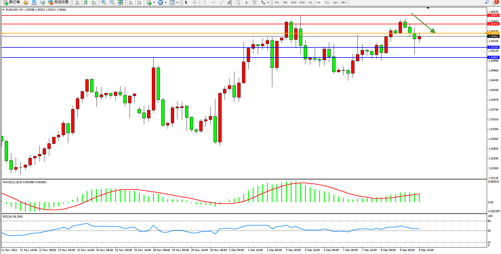欧元美元EURUSD—4小时K线图显示: