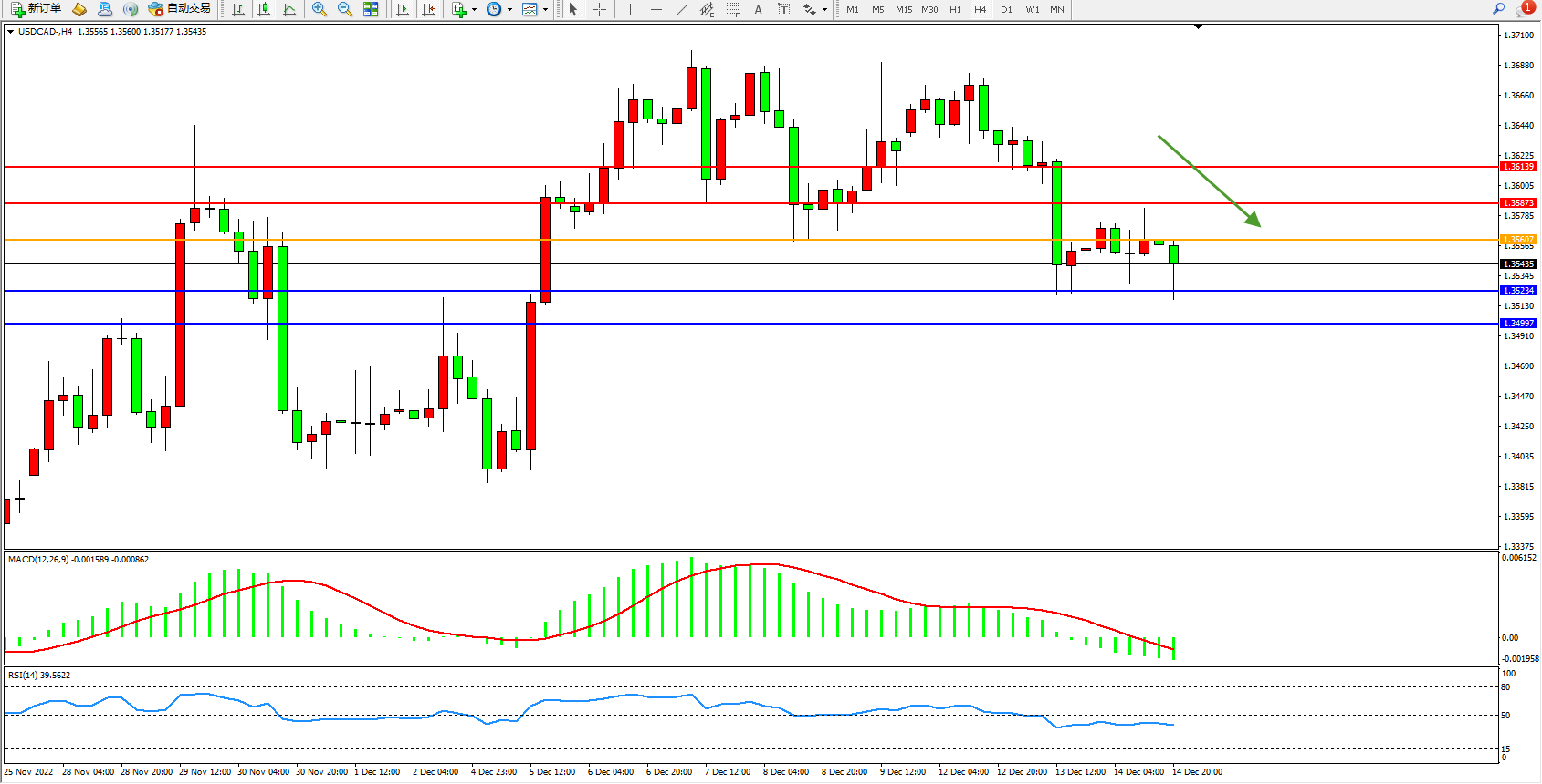 美元加元USDCAD——4小时K线图显示: