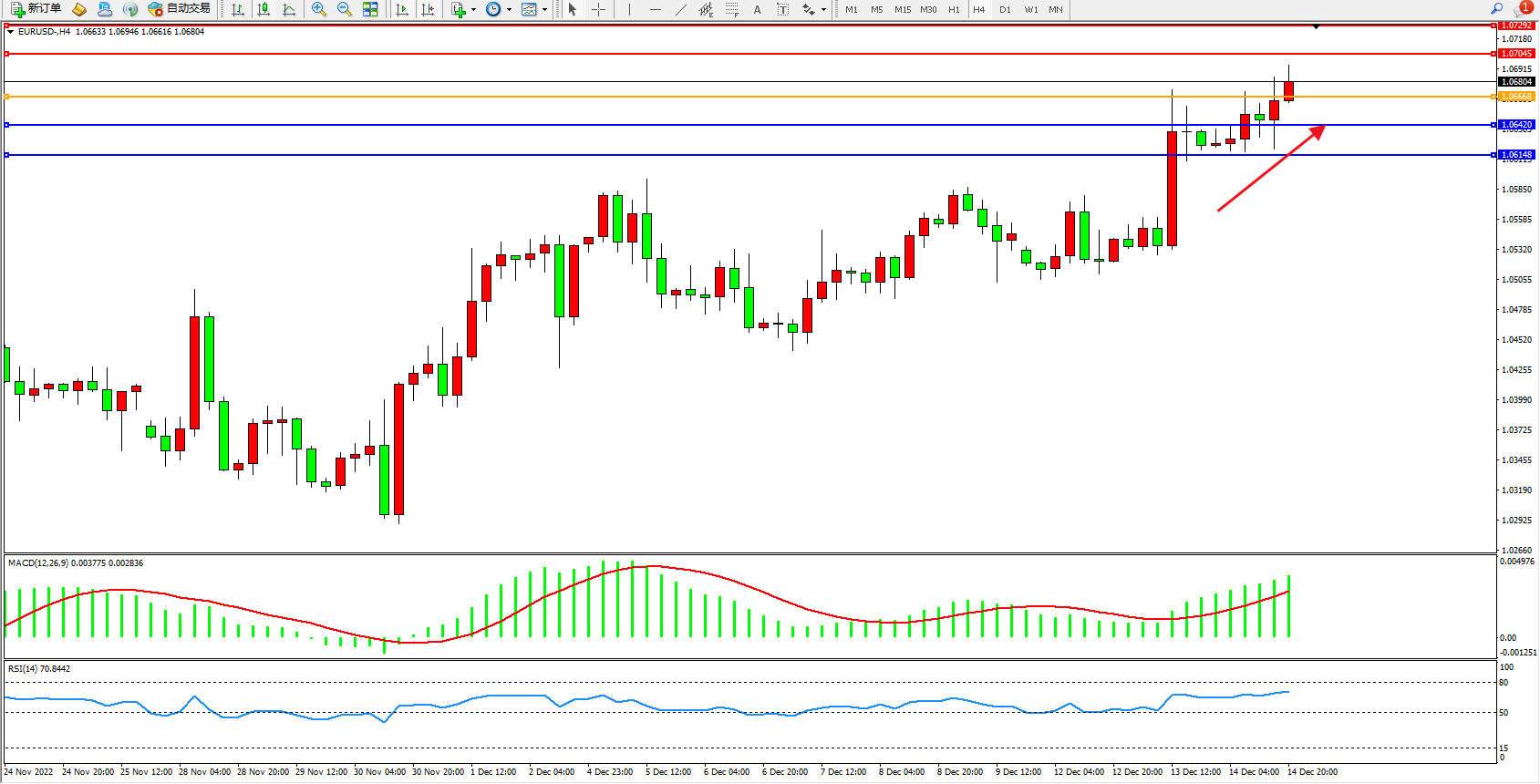 欧元美元EURUSD—4小时K线图显示: