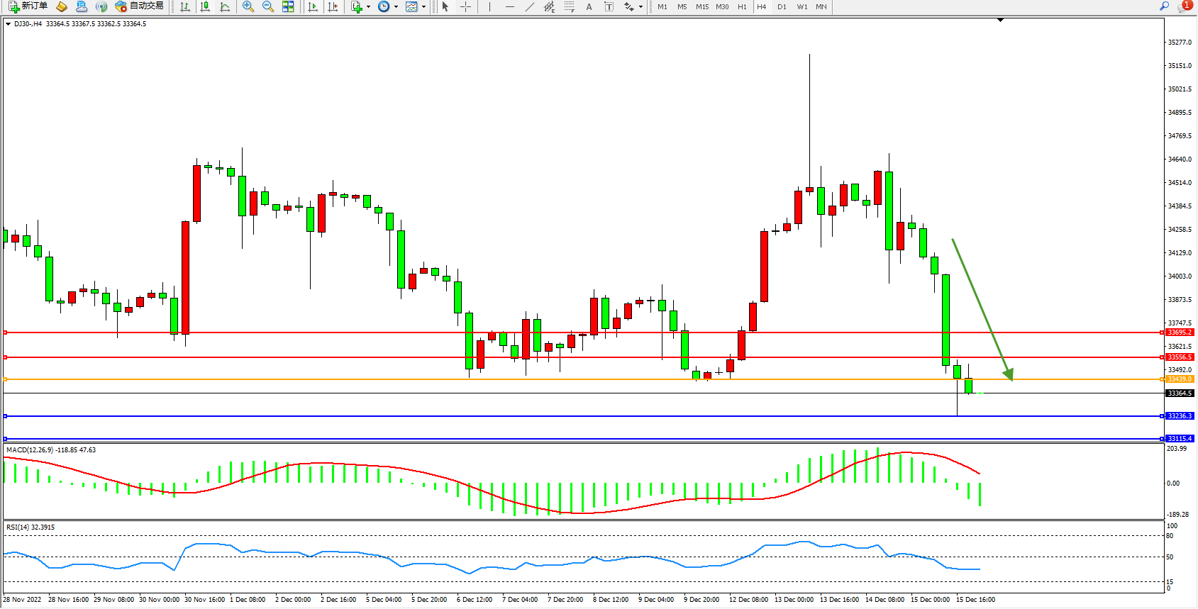 道琼斯指数DJ30——4小时K线图显示: