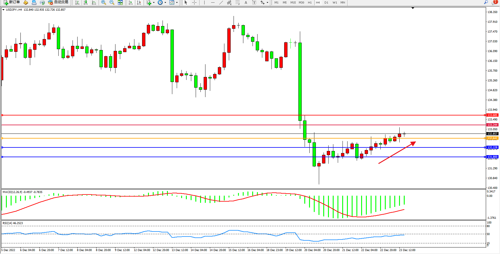 交易策略:122.642上方看涨,目标133.244、133.685