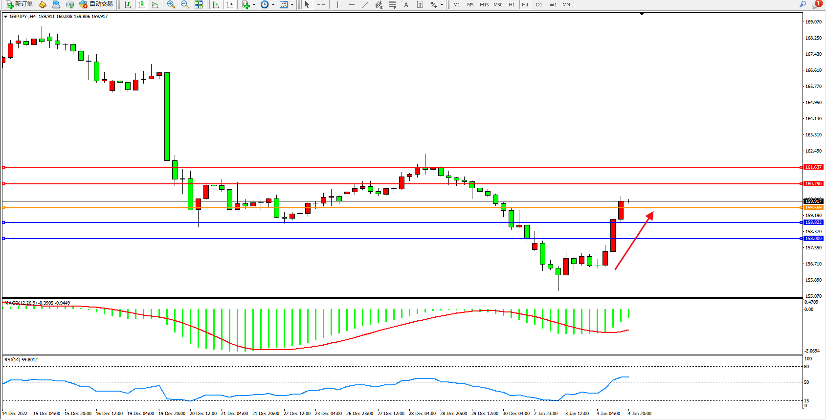 4小时图看:多头动力强势拉升上扬,短期看涨情绪涌现,市场多头不断攀升,MACD指标处于空头区域震荡上扬,RSI指标处于50均衡线上側震荡中;