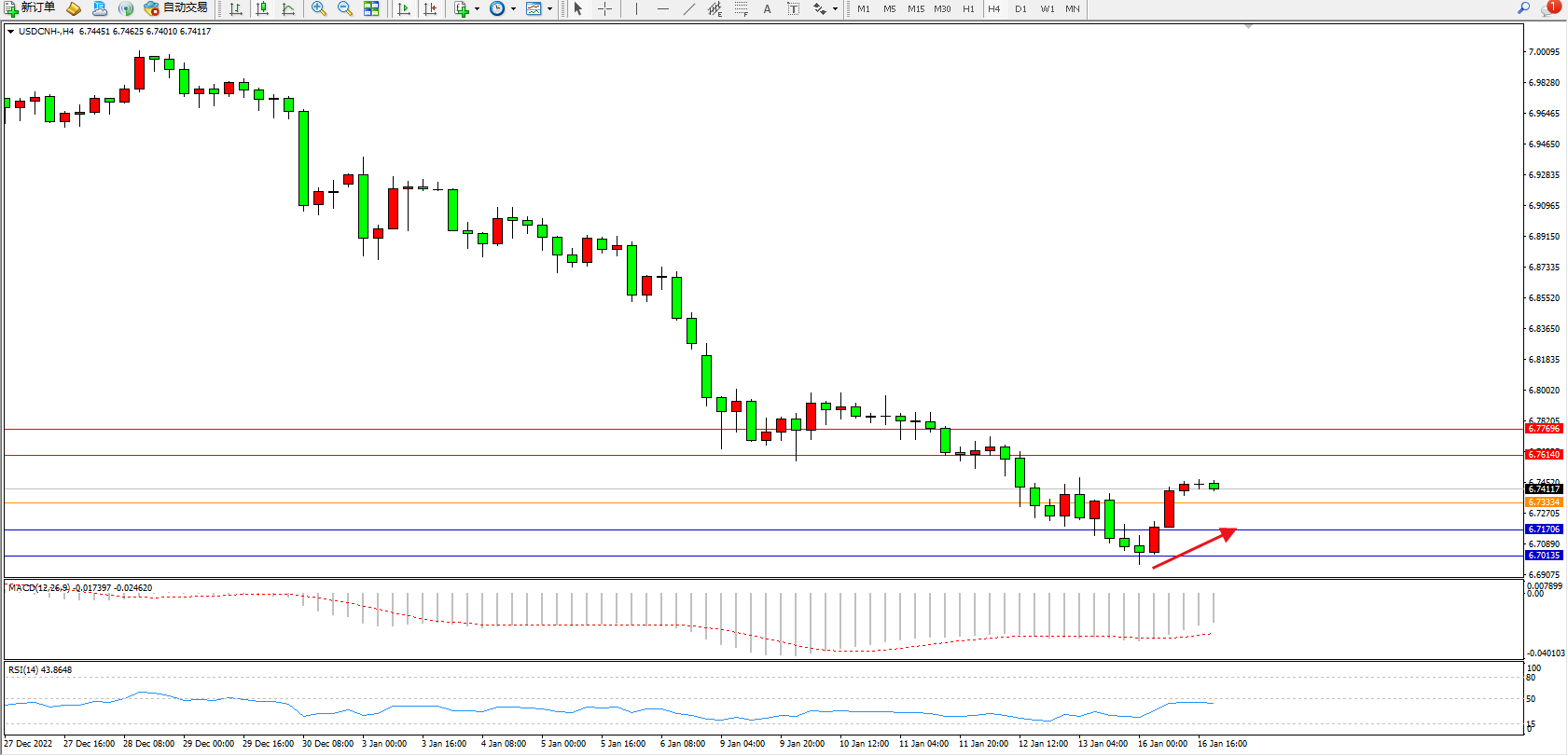 美元人民币USDCNH——4小时K线图显示: