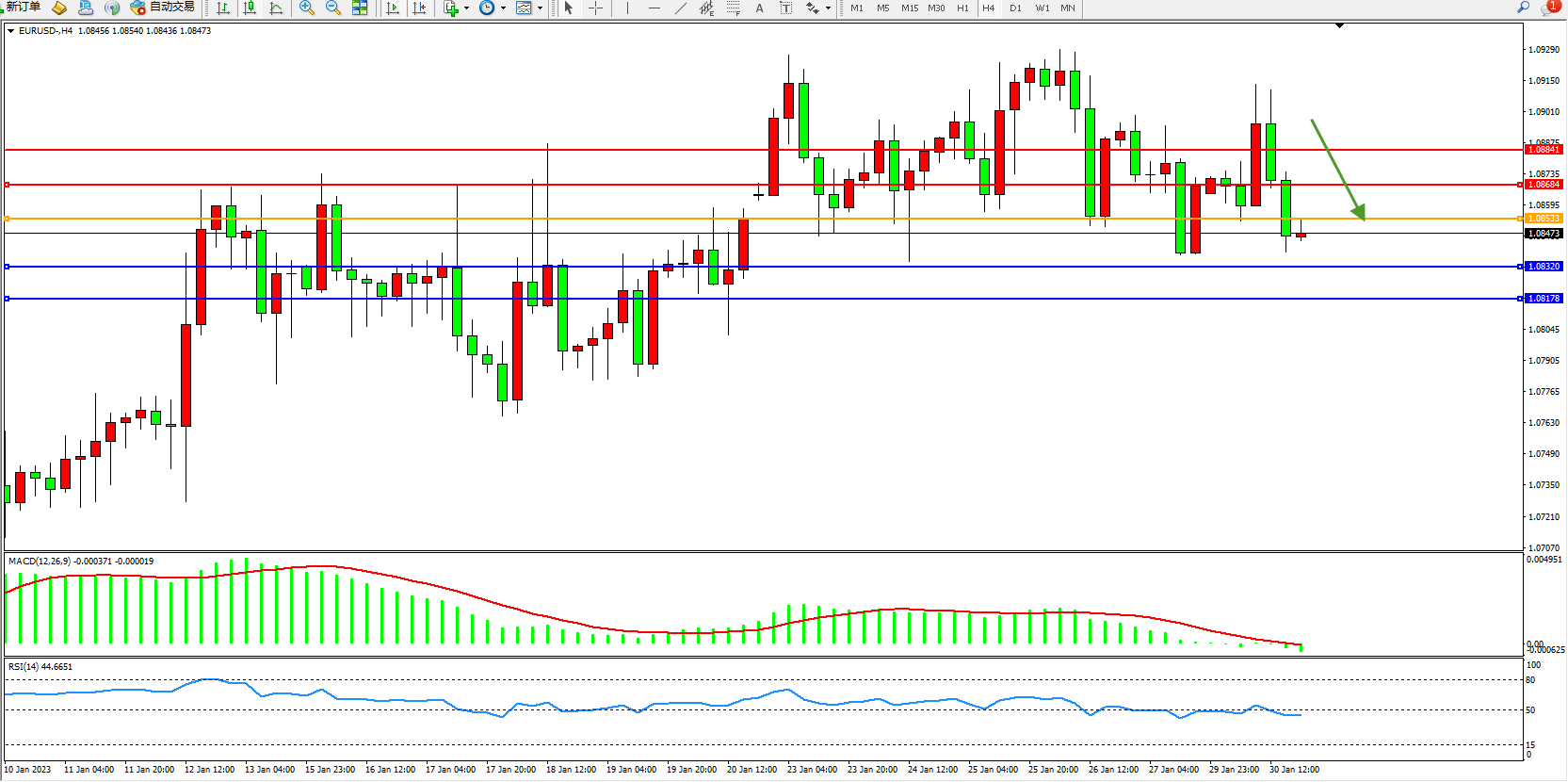 欧元美元EURUSD—4小时K线图显示: