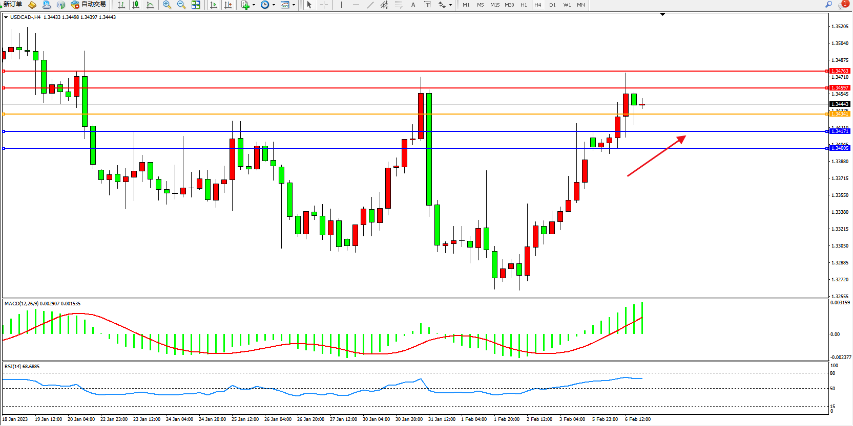 美元加元USDCAD——4小时K线图显示: