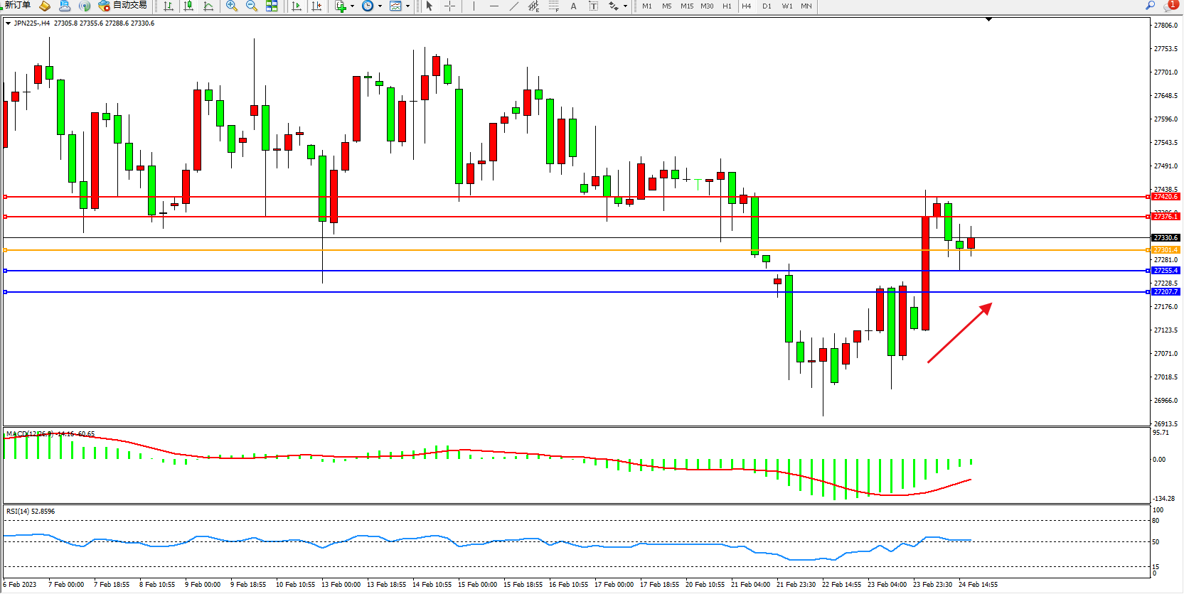 4小时图看:多头动力呈阶梯式震荡上扬,短期看涨情绪涌现,市场多头动力不断向上移动中,MACD指标处于空头区域维持整理上移,RSI指标处于50均衡线上側徘徊;