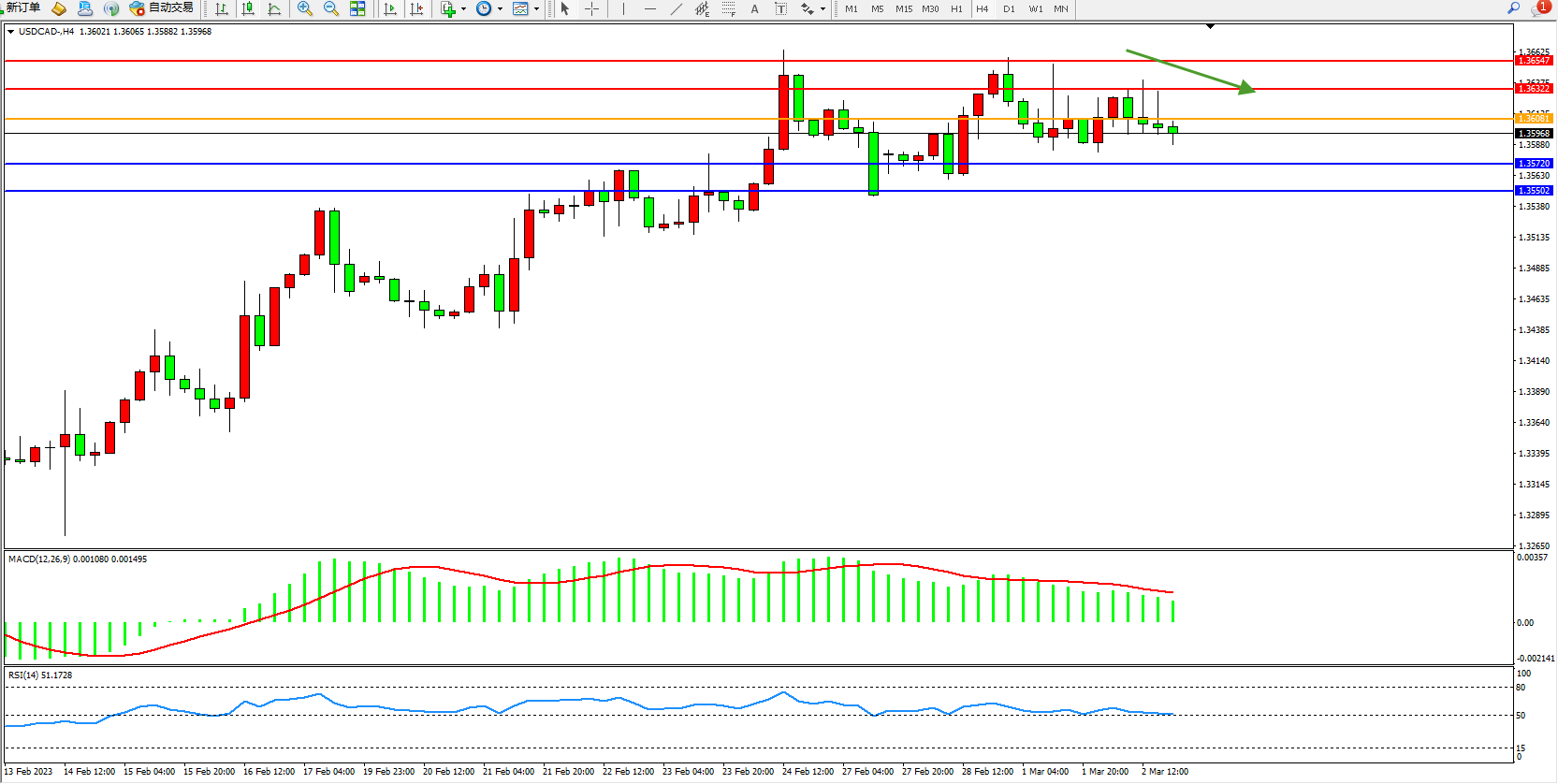 美元加元USDCAD——4小时K线图显示: