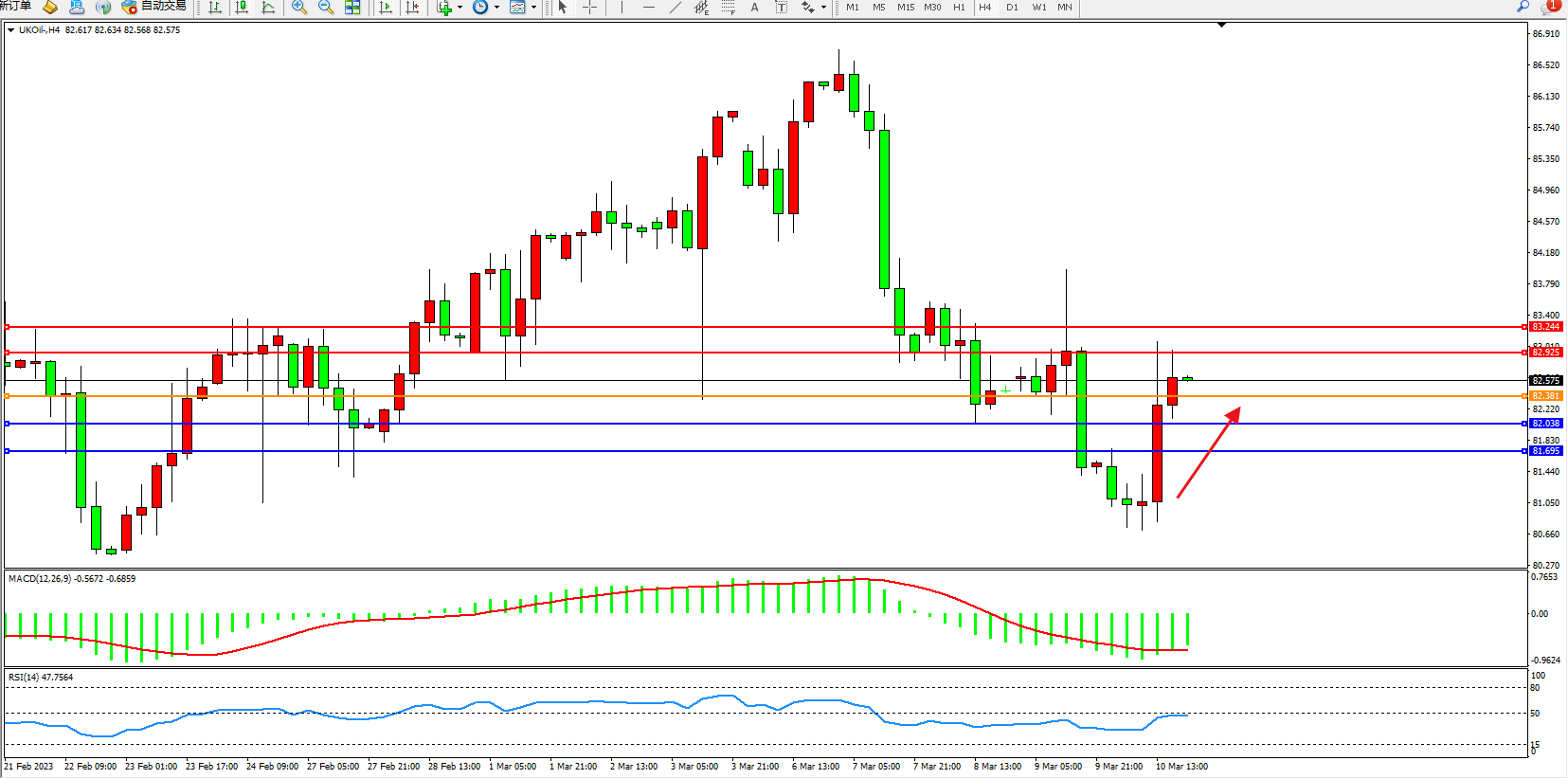 4小时图看:低位多头动力强势攀升,短期看涨情绪涌现,市场多头不断向上移动中,MACD指标处于空头区域低位上移,RSI指标处于50均衡线附近弱势徘徊;
