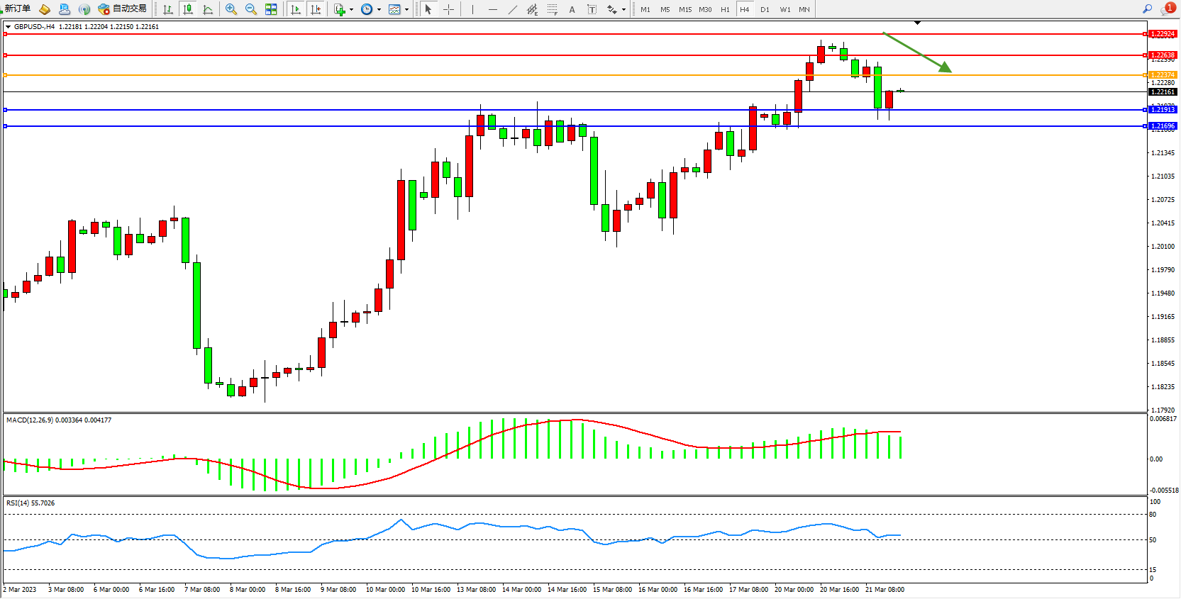 交易策略:1.22374下方看跌,目标1.21913 1.21696