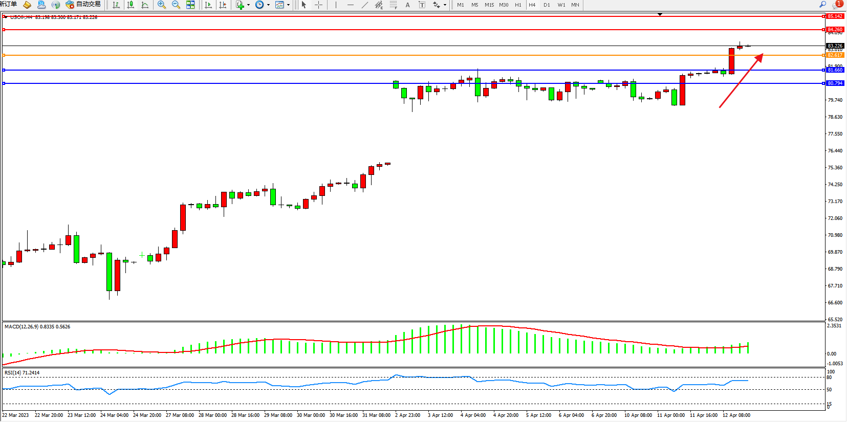 原油USOil——4小时K线图显示: