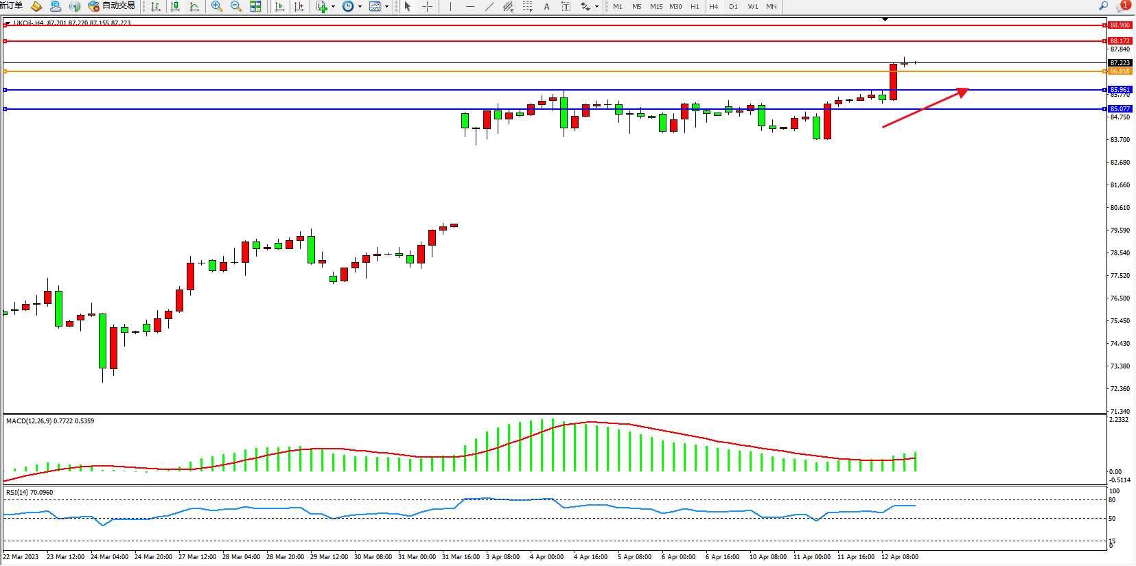 布油维持87.223附近震荡,在OPEC+主要产油国意外宣布他们将在5月至12月期间进一步减产166万桶/日之后,基金经理将他们对布伦特原油的净多头押注增加到有记录以来的第二大金额。