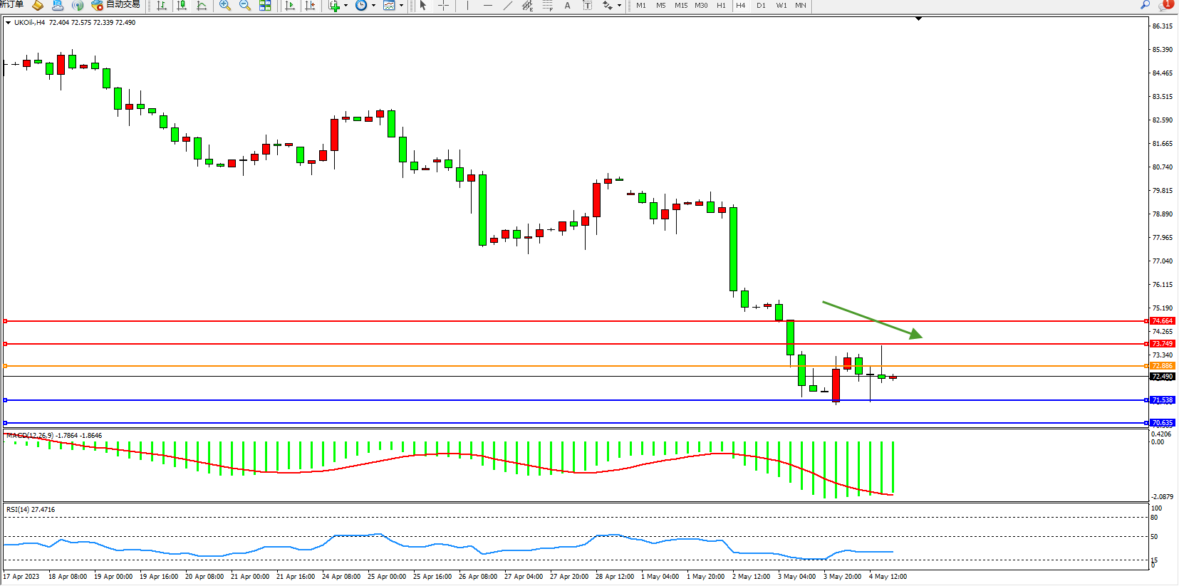 交易策略:72.886下方看跌,目标71.538  70.635