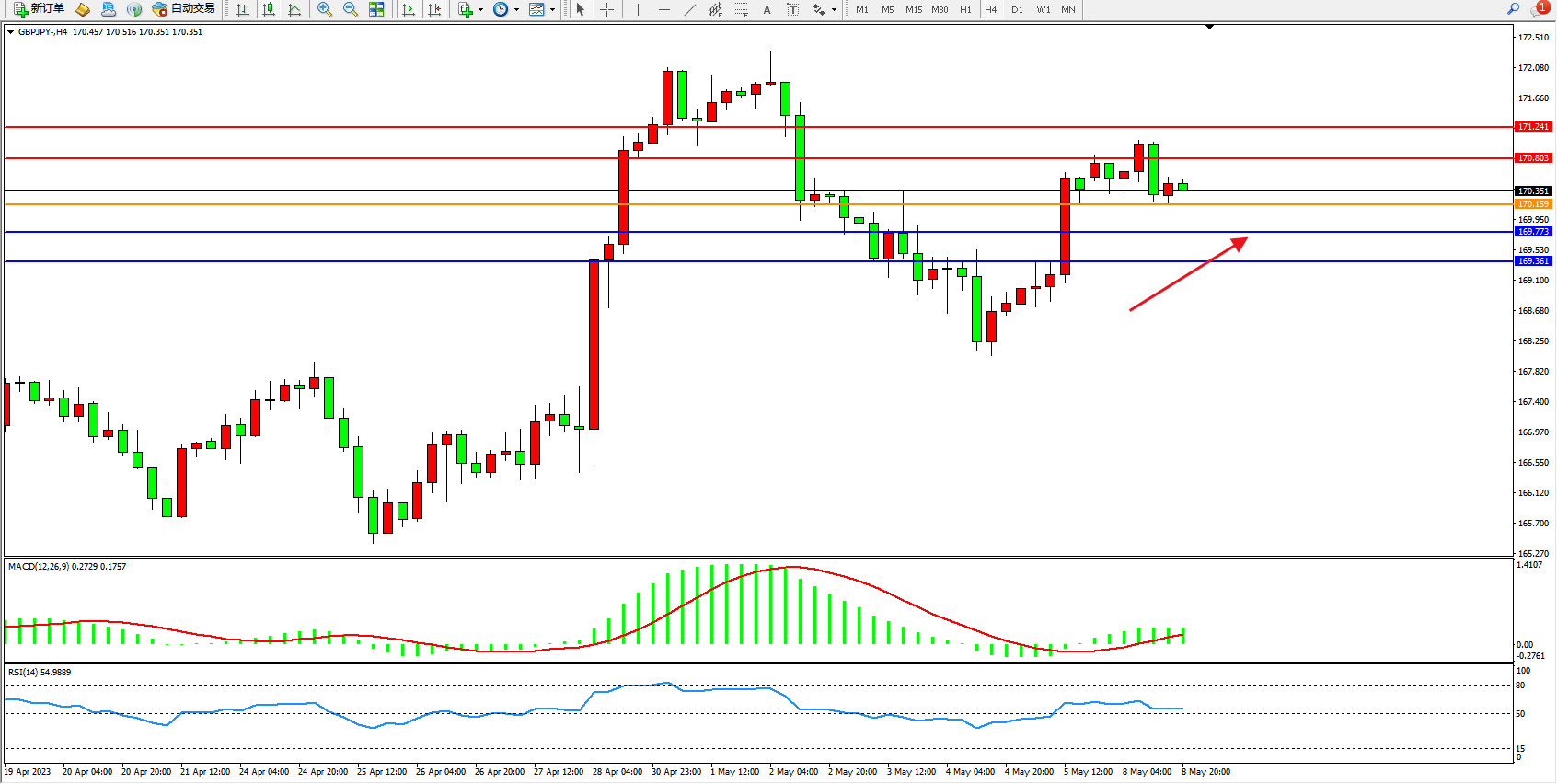4小时图看:多头动力维持震荡上行后整理,短期多头动力减弱,市场看涨趋势依旧,MACD指标处于0轴线上側弱势整理,RSI指标处于50均衡线上側弱势徘徊;