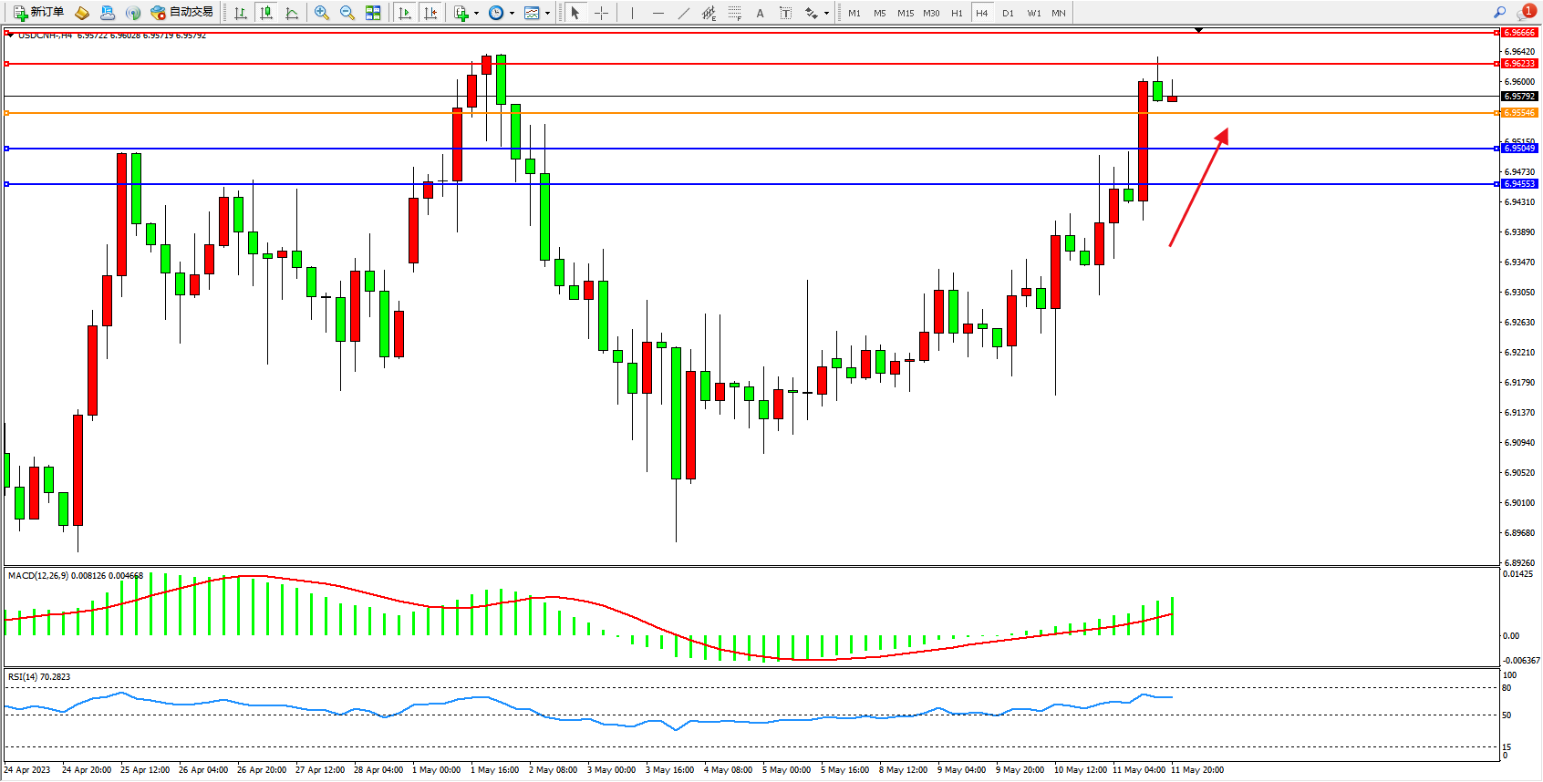 交易策略:6.95546上方看涨,目标6.96233  6.96666