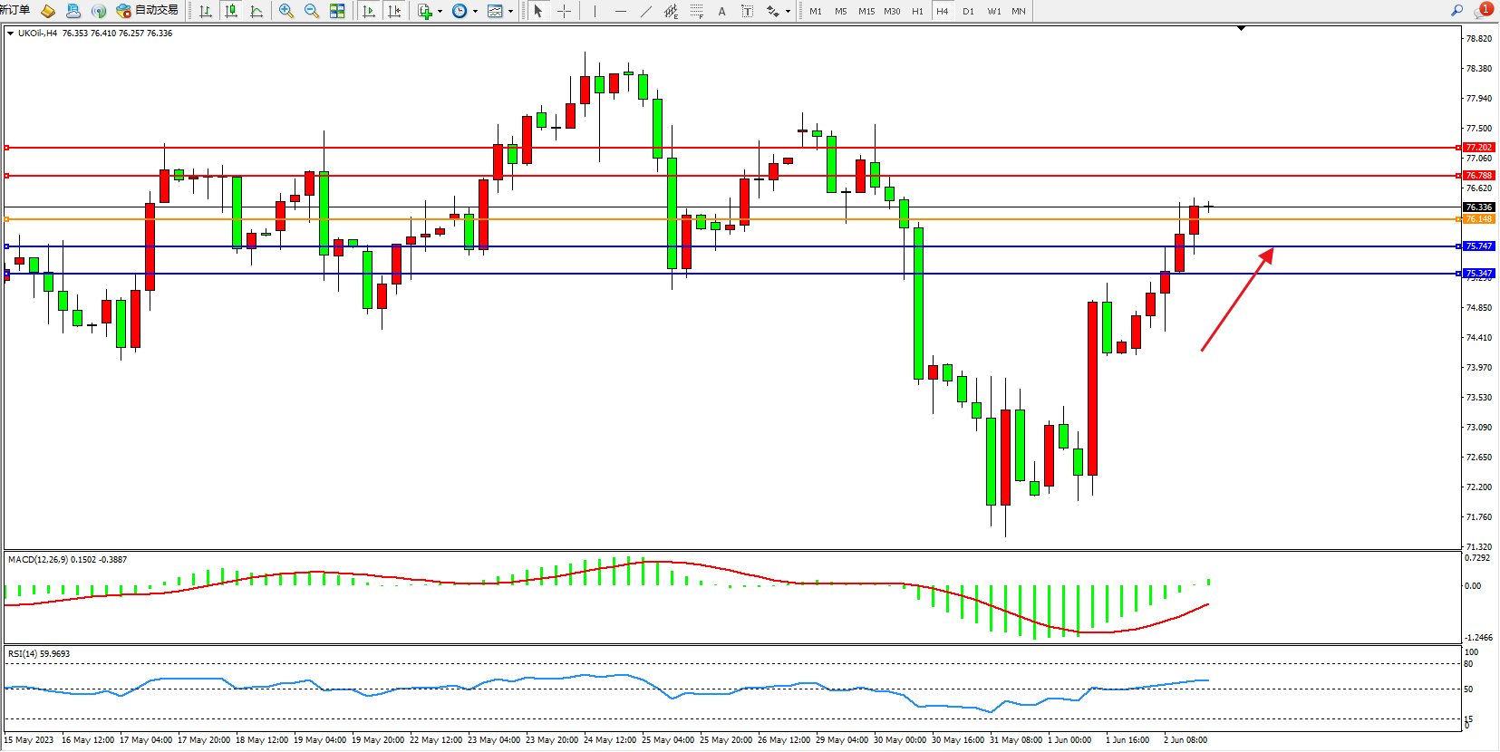 交易策略:76.148上方看涨,目标76.788 77.202