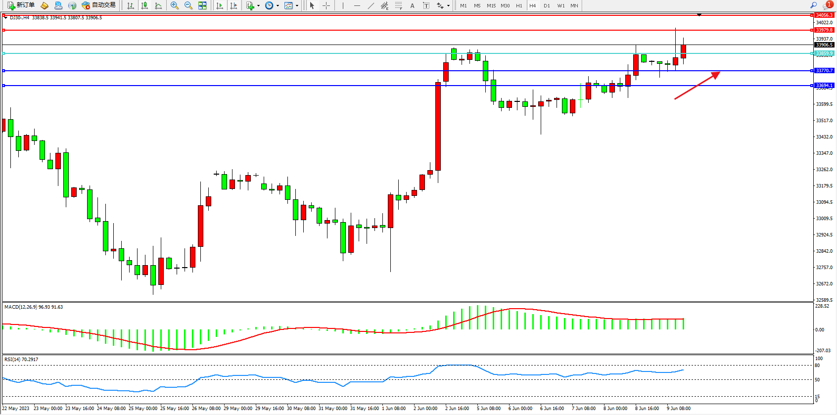 道琼斯指数6月9日(周五)收盘上涨43.63点,涨幅0.13%,报33877.24点;目前市场预计美联储下周按兵不动的可能性为72%,但7月加息的几率为67%。美国通胀仍持于2%的目标之上。