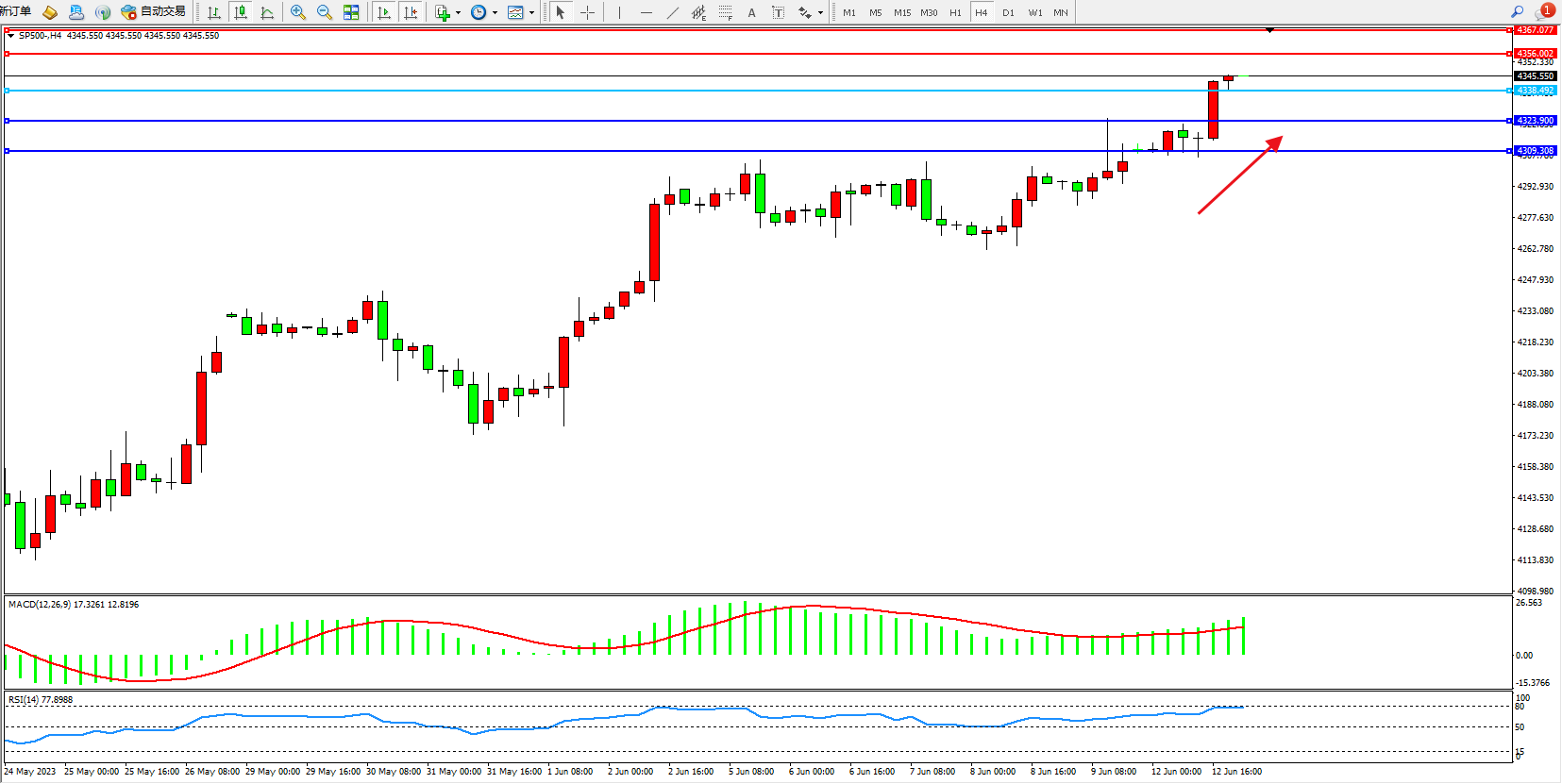 标普500指数6月12日(周一)收盘上涨41.84点,涨幅0.97%,报4340.70点;交易者认为美联储本周维持隔夜基准利率在5.00%-5.25%区间的可能性为77%,但7月重启加息的可能性达到66%。