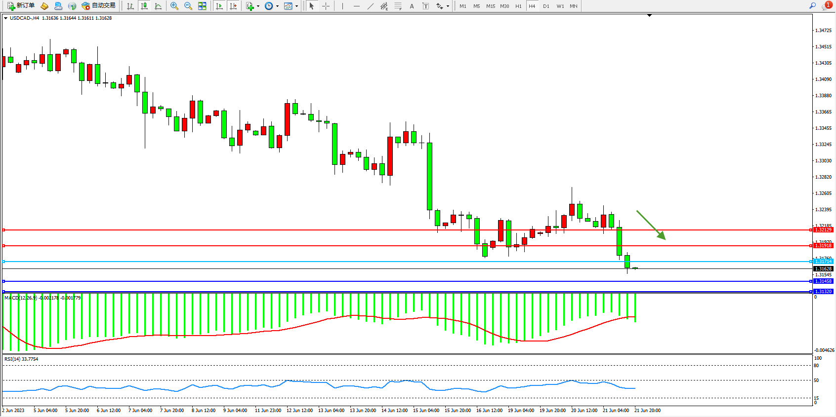 美元加元USDCAD——4小时K线图显示: