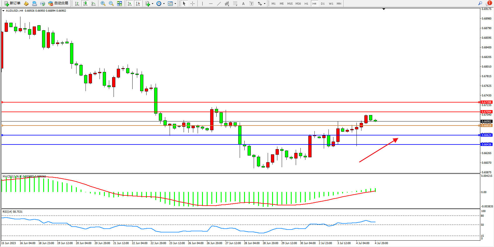 交易策略:0.66818上方看涨,目标0.67094  0.67288