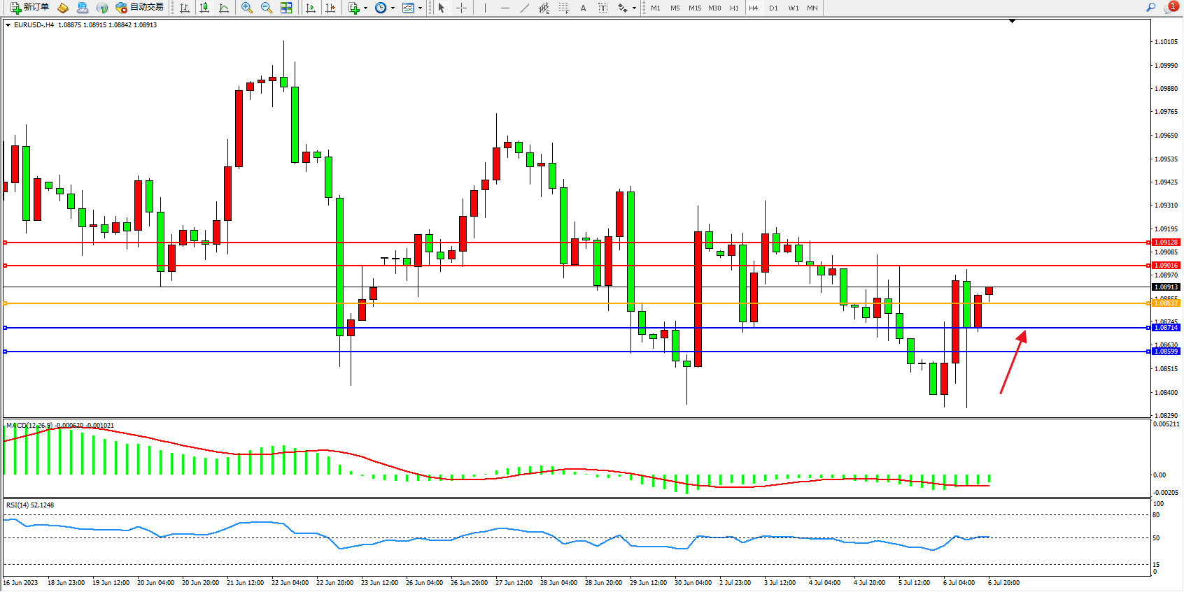 欧元美元EURUSD—4小时K线图显示: