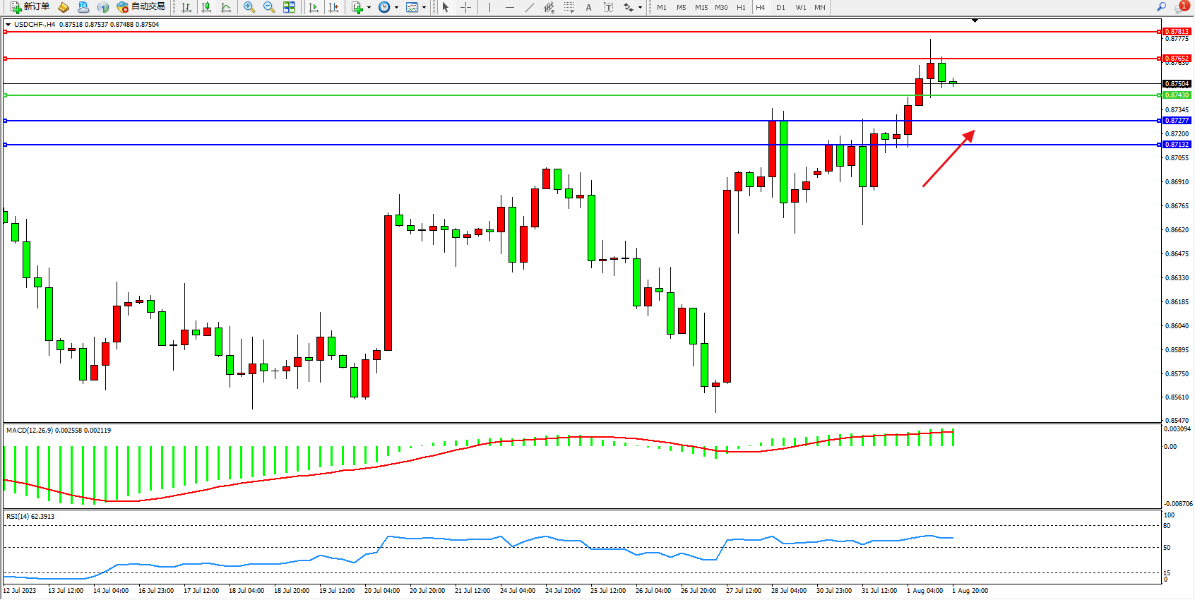 4小时图看:高位多头动力持续震荡上移,短期看涨情绪笼罩,MACD指标处于多头区域高位整理,RSI指标处于多头区域徘徊;
