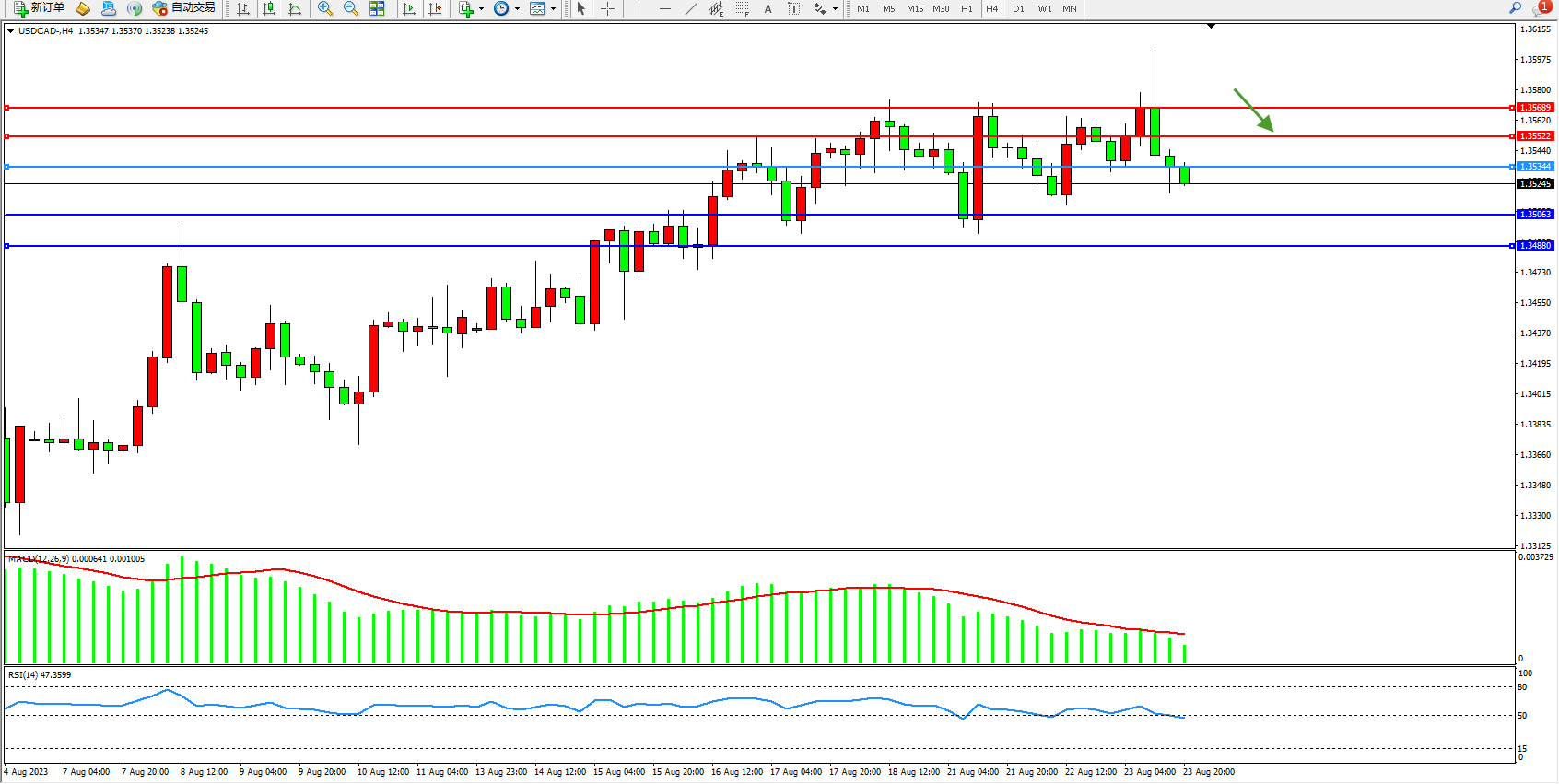 4小时图看:高位空头动力维持震荡下行,短期跌势或将持续,市场整体偏空头走势中,MACD指标维持整理有下移迹象,RSI指标处于50均衡线附近徘徊;