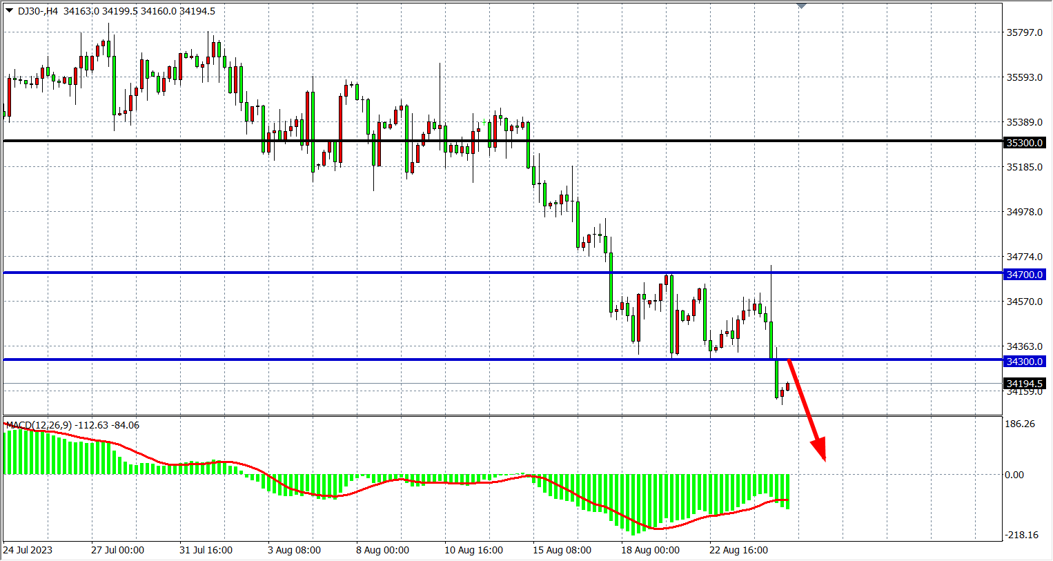 4小时图看,道指跌至34300之下,再度创出新低,MACD维持在零轴下,34300支撑转为阻力,下方看33900-33600。