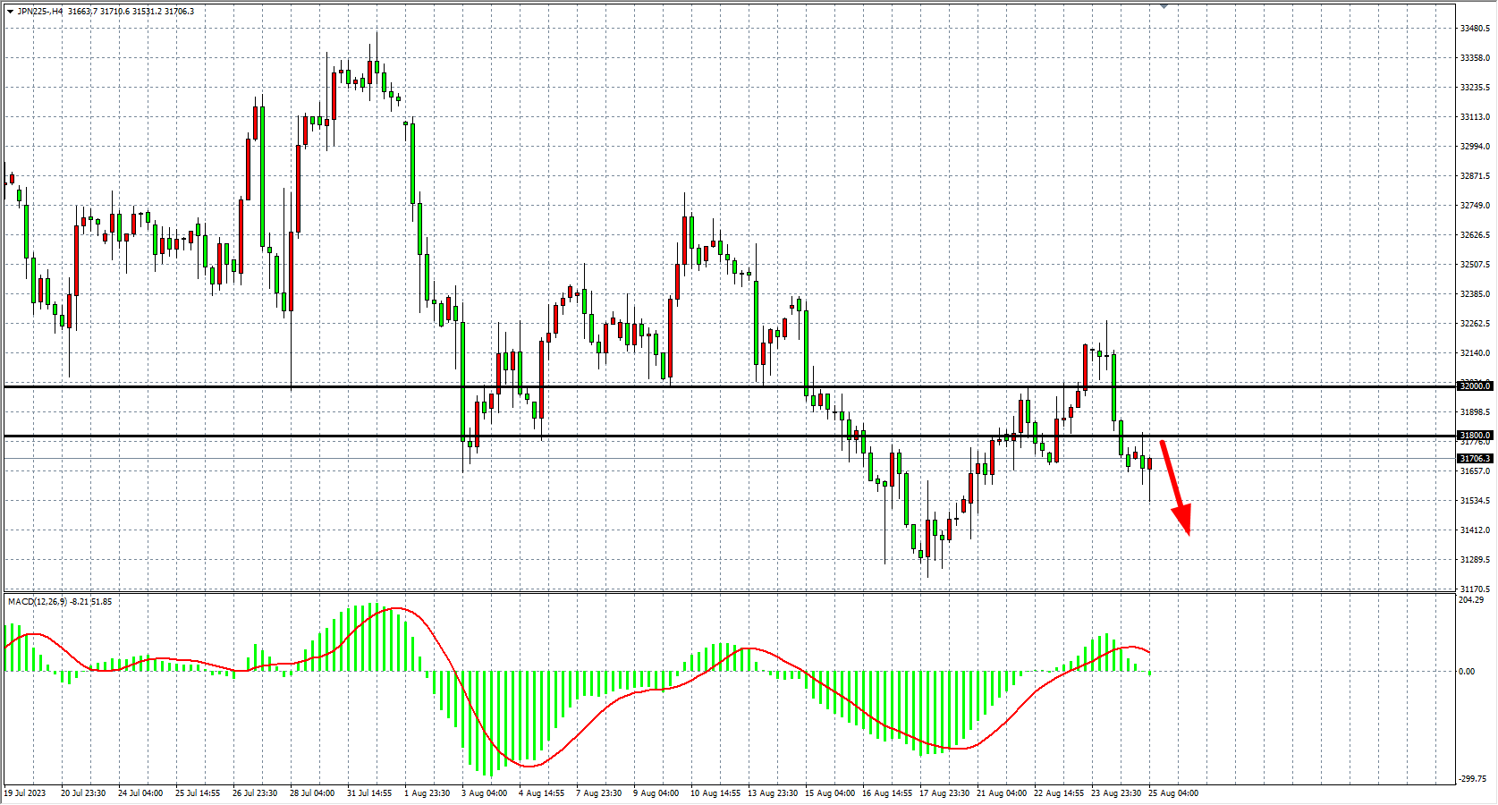 4小时图看,日经指数在32300一线受阻后回落至31500附近,MACD量能再次下穿零轴,行情走势再度偏弱,阻力关注31800-32000,支撑关注31400-31200附近。