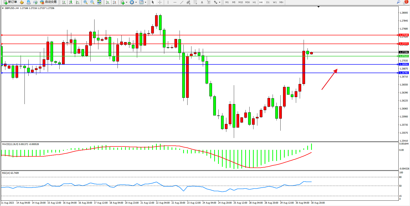 4小时图看:多头动力强势攀升,短期有继续向上移动态势,MACD指标维持震荡上移至0轴线上側上移,RSI指标处于50均衡线上側整理;