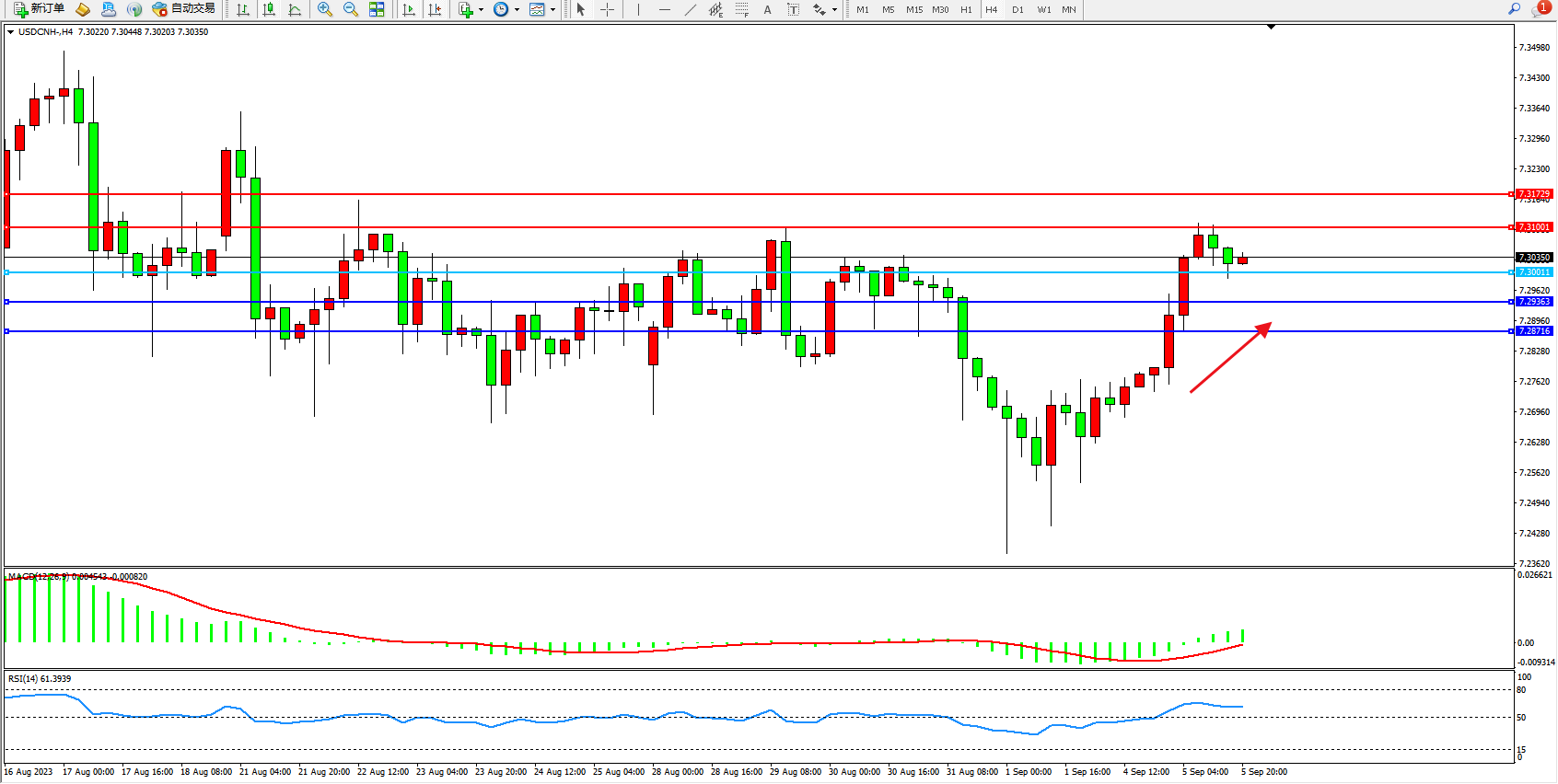 交易策略:7.30011上方看涨,目标7.31001  7.31729