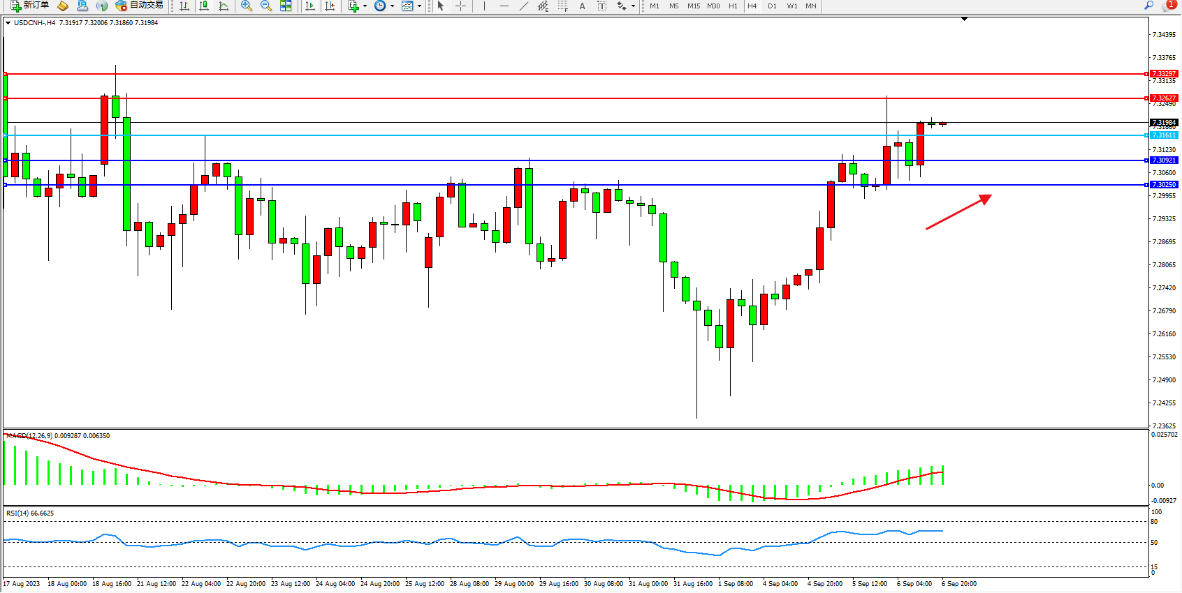 美元人民币USDCNH——4小时K线图显示: