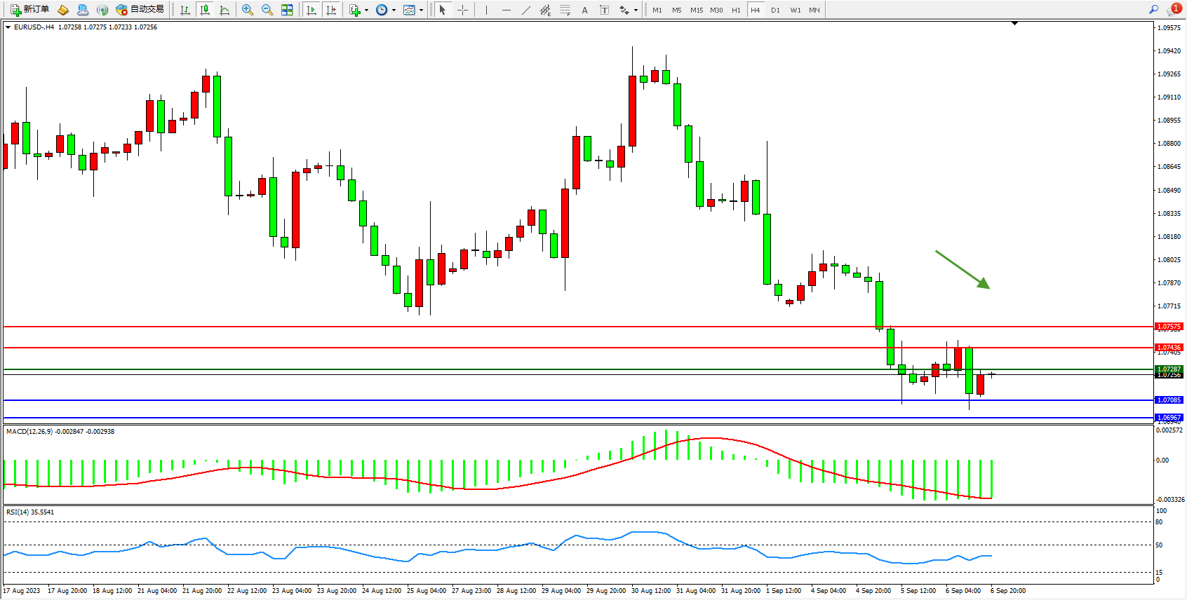 欧元美元EURUSD—4小时K线图显示:
