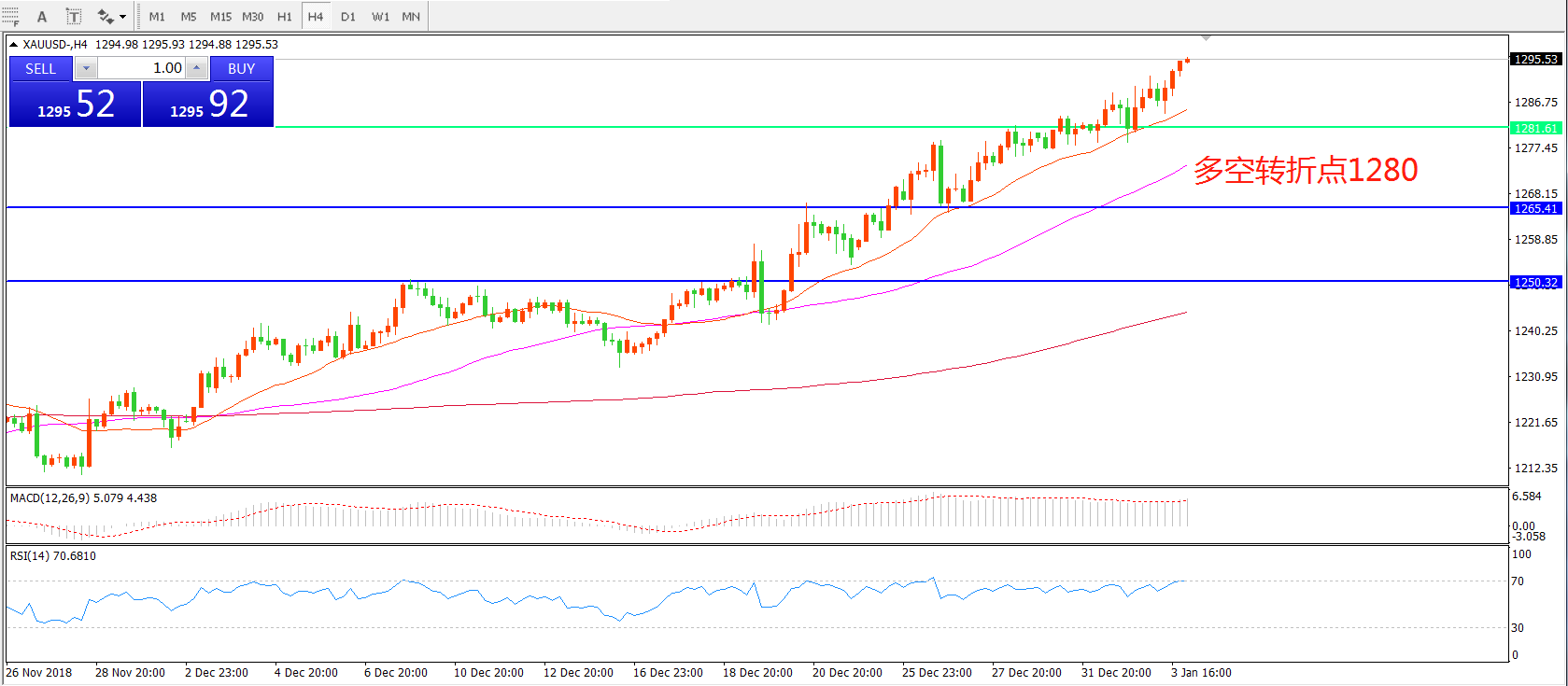 4小时图看,黄金站稳1280后强势上行,整体走势偏强,均线呈现多头排列,短期仍是偏多思路。