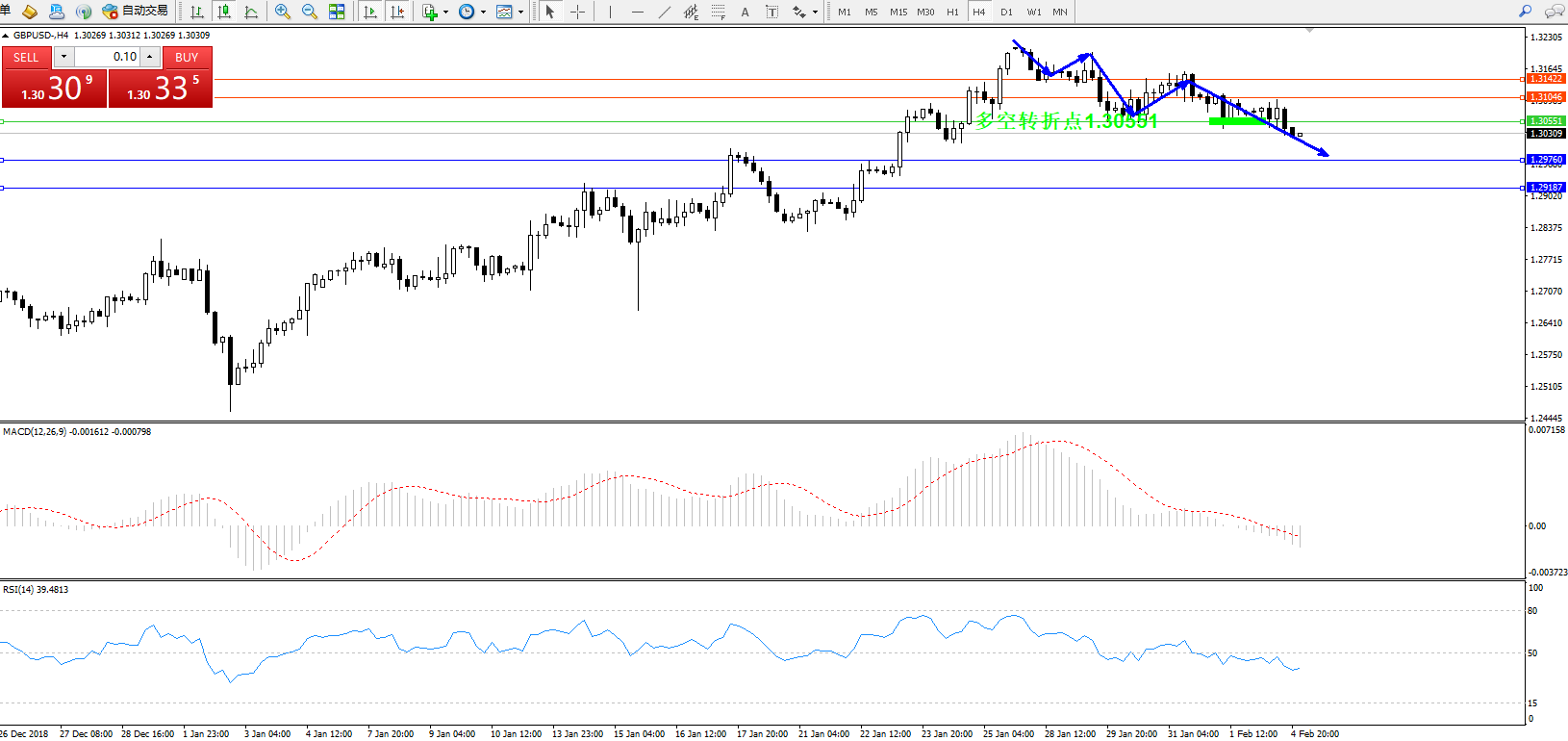 交易策略:1.30551下方看跌,目标1.297601.29187