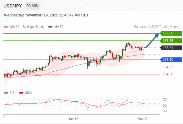 在 155.10 之上,看涨,目标价位为 155.75 ,然后为 156.00 。