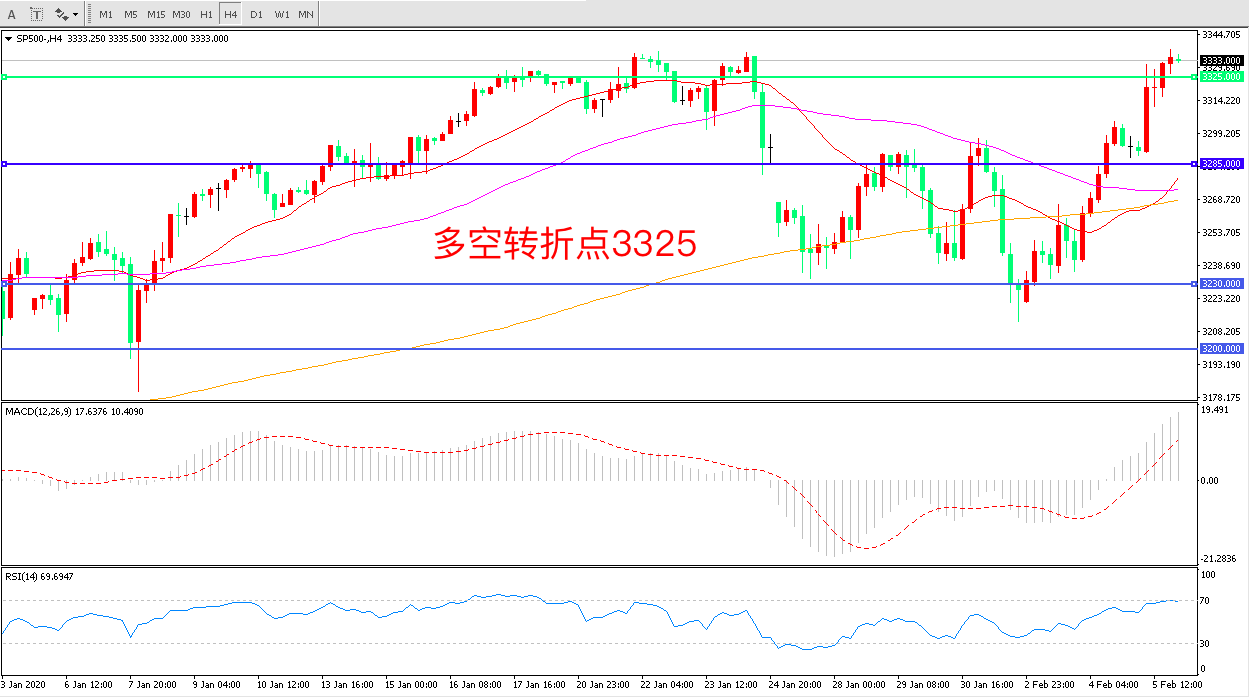 4小时图看,标普长阳连续拉升,逼近前期高点,短期均线拐头,MACD红柱增加,RSI指标走平,日内延续上行概率较大。