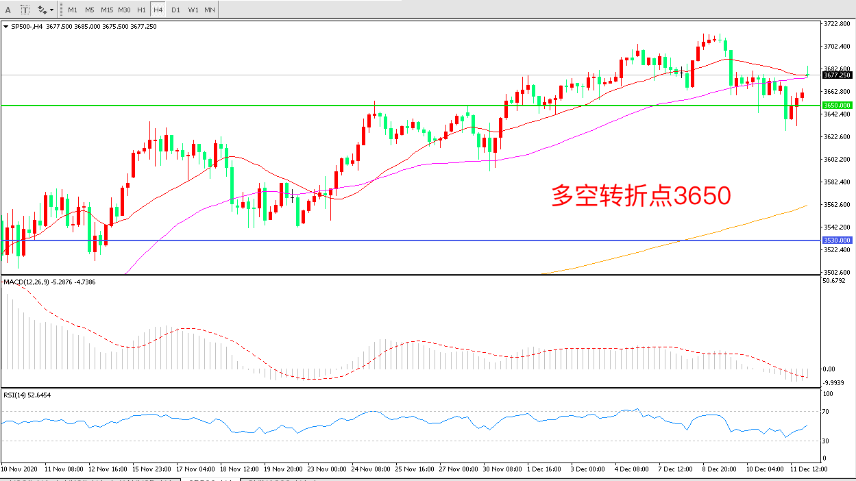 4小时图看,标普500高位震荡后长阴下坡,短期涨势遭到破坏,短期均线拐头向下,3650成为短期支撑, MACD红柱减少,绿柱增加,RSI指标走平,日内延续震荡概率较大。