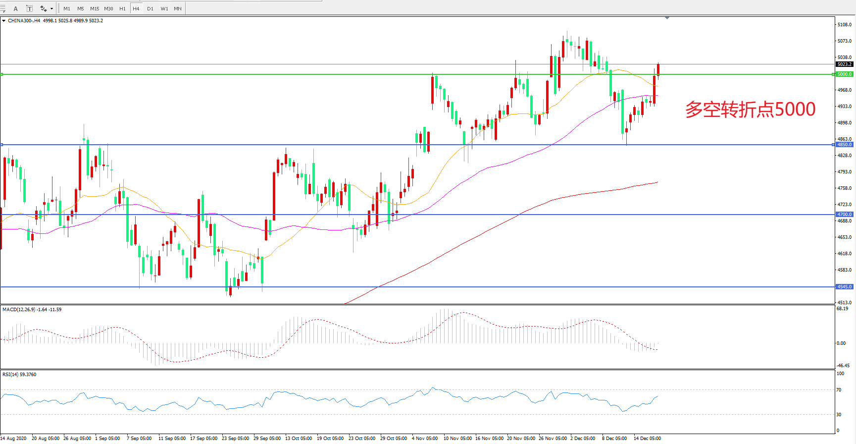 4小时图看,沪深300阳线连续拉升,强势突破5000附近阻力,整体表现偏强,均线系统走平,MACD绿柱减少,RSI指标向上,日内延续上行概率较大。