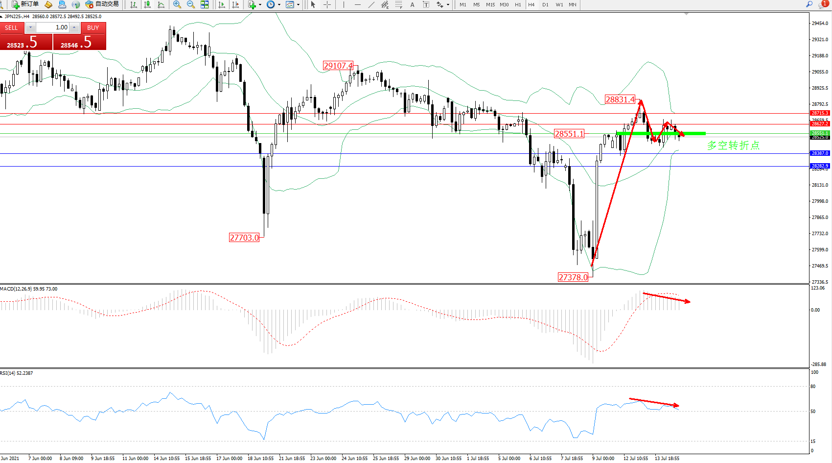 技术点评:多头动力强势回升至28831附近遇阻回撤,触及布林带指标中轨附近节点后开始震荡,且布林带指标通道呈收口走势中,高位空头压制短期内依旧强劲,MACD指标处于多头区域维持整理回撤,RSI指标处于50均衡线上方多头区域维持整理平移中;